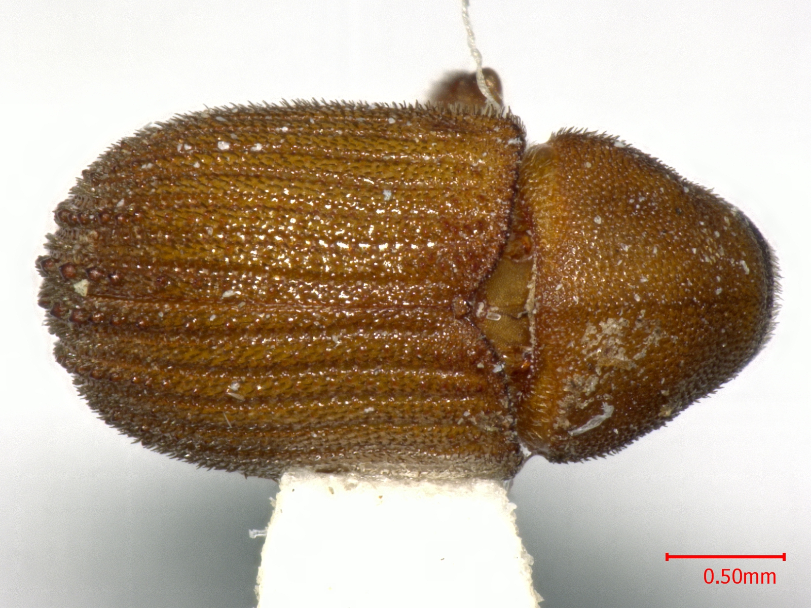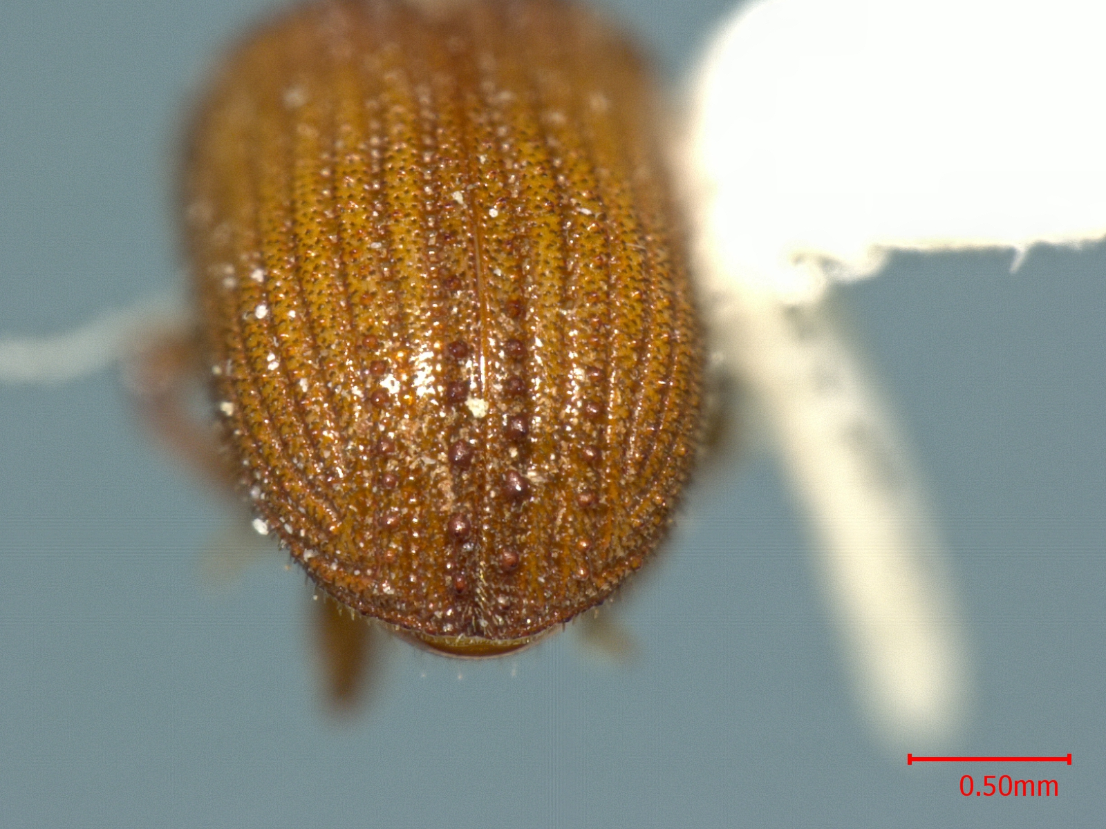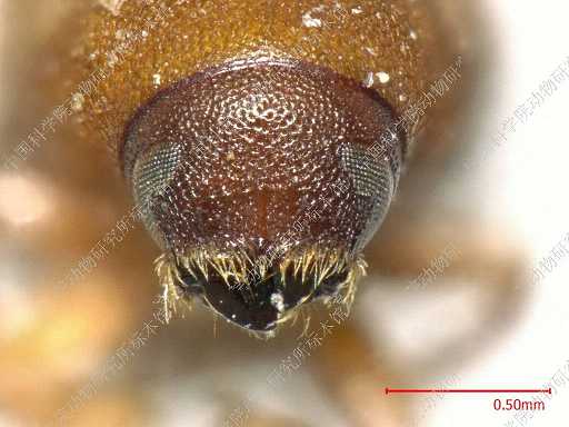 描述:体长2.0-3.8毫米,平均3.1毫米。复眼凹陷较浅(图49:4-5),两眼间的距离较宽。雄虫额部稍许凹陷,额中心无凹点,中隆线发生于额面下半部,狭窄低弱,额底面平滑光亮;刻点稠密,在额面下半部有时上下通连,成为短小的纵沟,刻点间隔突起成粒,细小均匀;额毛刚劲短小,额下部直向竖立,额上部簇向额顶中部;雌虫额面略较短阔隆起,两性额部相似。前胸背板长略小于宽,长宽比为0.8,背面观轮廓呈梯形;背板底面平滑光亮;刻点细小深圆,稠密均匀,刻点间隔小于直径;背板上的茸毛稠密,起自刻点中心,贴伏于板面上,指向背中线。鞘翅长度为前胸背板长度的1.9倍,为两翅合宽的1.4倍。鞘翅基缘略隆起,上面的锯齿大小均一,相距紧密。刻点沟狭窄轻陷,沟底平滑,沟中刻点圆形,刻点直径与沟宽相等,并小于刻点间距,刻点中心光秃无毛;沟间部宽阔低平,上面的刻点圆而略深,分布不匀,常横向连成短沟,刻点间隔突起成粒,点、粒、沟、谷相互交织,构成既粗糙又均匀的表面;沟间部的毛被厚密,向后方斜竖,在翅基部象似刚毛,以后渐宽,又象鳞片,各沟间部横排4-5枚(图53: 1)。第1、3沟间部隆起,第2沟间部上的颗瘤形似尖桃,顶尖向后,相距紧密,第1、3沟间部各约10枚以上,第2沟间部6-7枚,靠近翅端,第3及其以外各沟间部2-3枚。雌虫鞘翅斜面沟间部的起伏和颗瘤的排列与雄虫相同,但颗瘤显著细小。