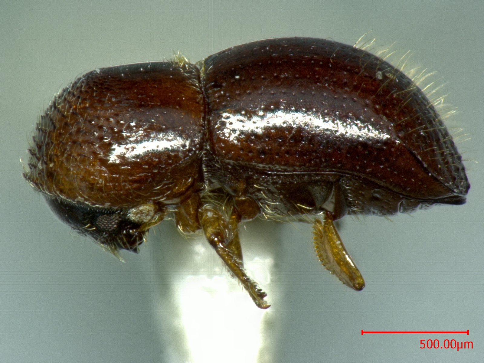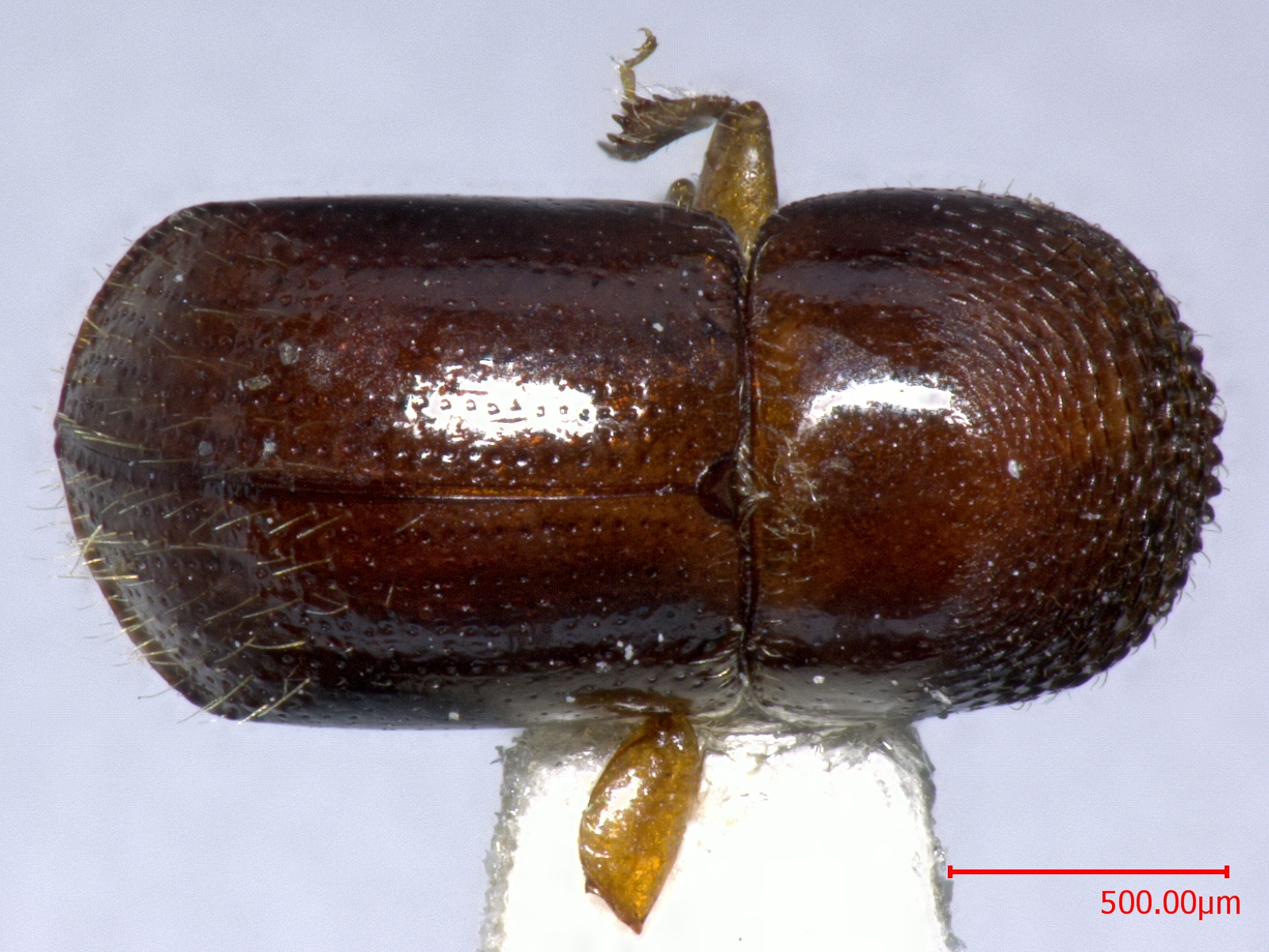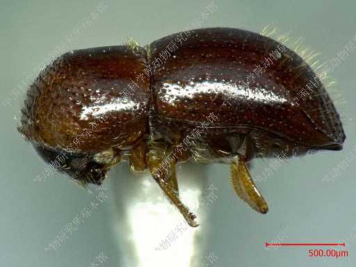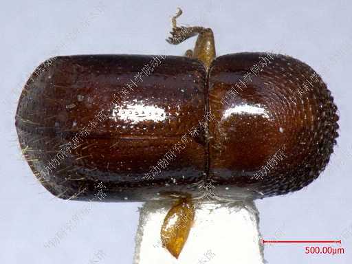 描述:雌虫:体长约2.3毫米。圆柱形,较宽阔,黑褐色,前胸背板和鞘翅后半部着色较深,体表平滑光亮。眼前缘中部的缺刻圆钝深陷,约达眼宽的一半。额部平隆,底面有粒状密纹,光泽甚强,额上部的刻点凹陷,下部突起成粒,分布均匀,额面有中隆线,起自口上片,止于额心以上,额毛竖立舒展,疏密适中。前胸背板长小于宽,长宽比为0.9;背面观轮廓呈短盾形;侧面观背板前半部强烈弓曲上升,后半部平直下倾,背顶部在中部,圆弓而不突出。瘤区和刻点区各占背板长度的一半;瘤区的颗瘤端头前伸,形大尖利,瘤间空隙宽阔,在背顶部颗瘤变得低平,横向扁长,连成弧列,渐次减弱;在背板前缘上有8-9枚大小均匀的颗瘤,排成横列。刻点区底面有纵线状印纹,其间杂有平滑无纹小区;刻点区的刻点圆小轻浅,没有背中线;背板的茸毛短小,分布在瘤区,起自颗瘤顶端之后;刻点区无毛。鞘翅长度为前胸背板长度的1.4倍,为两翅合宽的1.2倍;背面观鞘翅两侧缘直线后伸,同时略许加宽,翅翅长后1/5处急剧收尾,侧面观鞘翅从基至端均匀弓曲,没有明显的斜面上缘,不斜面下侧缘边(图117:3)。小盾片形大中凹,三角形,角顶圆钝。刻点沟轻陷,沟中刻点大小疏密适中,点心下陷,排成径直的纵列;沟间部宽阔,有一列刻点,形状与沟中刻点相似,略较疏少。鞘翅斜面弓突,沟间部高低增匀,斜面下侧缘边锐利,突起上翘;在斜面上沟间部的刻点突起成粒;鞘翅的茸毛发生在沟间部,排成纵列,从翅中部起,止于翅端,翅前部光秃。   主要特征:(1)鞘翅刻点沟的刻点大小适中,点心凹陷,不平浅;(2)沟间部的刻点与沟中相似,略较疏小,在鞘翅前背方全部凹陷,在斜面上突成小粒;(3)鞘翅斜面下侧缘边锐利,突起上翘;(4)鞘翅的茸毛起自沟间部,仅发生在鞘翅后半部。   雄虫:体长1.7毫米。短小弓突,前胸背板与鞘翅的交界为最高点,褐色,光泽甚强,茸毛细弱匀布。眼前缘的角形缺刻甚小。触角锤状部与雌虫相同,节间与毛缝仅发生在锤状部的外面(图117:1),锤状部的里面光秃,无节无毛。额部略突,刻点不明,仅有粗糙不整的刻纹,额上部刻纹散放,下部刻纹聚集在口上片中部;有中隆线,额毛疏少,短小柔弱。前胸背板长小于宽,长宽比为0.8;背面观鞘翅基缘横直,两侧缘与前缘连合弓曲,成一半圆,轮廓业短盾形,最大宽度在背板基缘附近,侧面观背板前2/3弓上升,为瘤区,后1/3水平延伸,为刻点区。瘤区中的颗瘤形如短小的横堤,相互连成弧线,逐层上升,止于背顶,弧线之间有宽阔明亮的空隙。刻点区底面平滑,刻点甚小,似有似无;瘤区中的茸毛纤细直立,分布均匀;刻点区光秃无毛。鞘翅长度为前胸背板长度的1.6倍,为两翅合宽的1.3倍;背面观鞘翅基缘横直,两侧缘基部的2/3直线后伸,端部的1/3收成圆钝狭窄的翅尾;侧面观鞘翅表面由基至端一直下倾,尤以鞘翅后半部更甚,是为斜面。小盾片较大,呈圆钝的三角形。鞘翅表面一片平坦,没有沟中与沟间之分,翅面的刻点甚小,散布均匀稀疏;鞘翅斜面刻点变密,仍旧微小,点心生柔细长毛,散放在鞘翅后半部,鞘翅前半部光秃无毛,斜面下侧缘边锐利,将斜面圈括起来。   与雌虫的区别:(1)体小,形状弓突;(2)鞘翅平坦,不分沟中与沟间,翅面刻点微小稀疏。