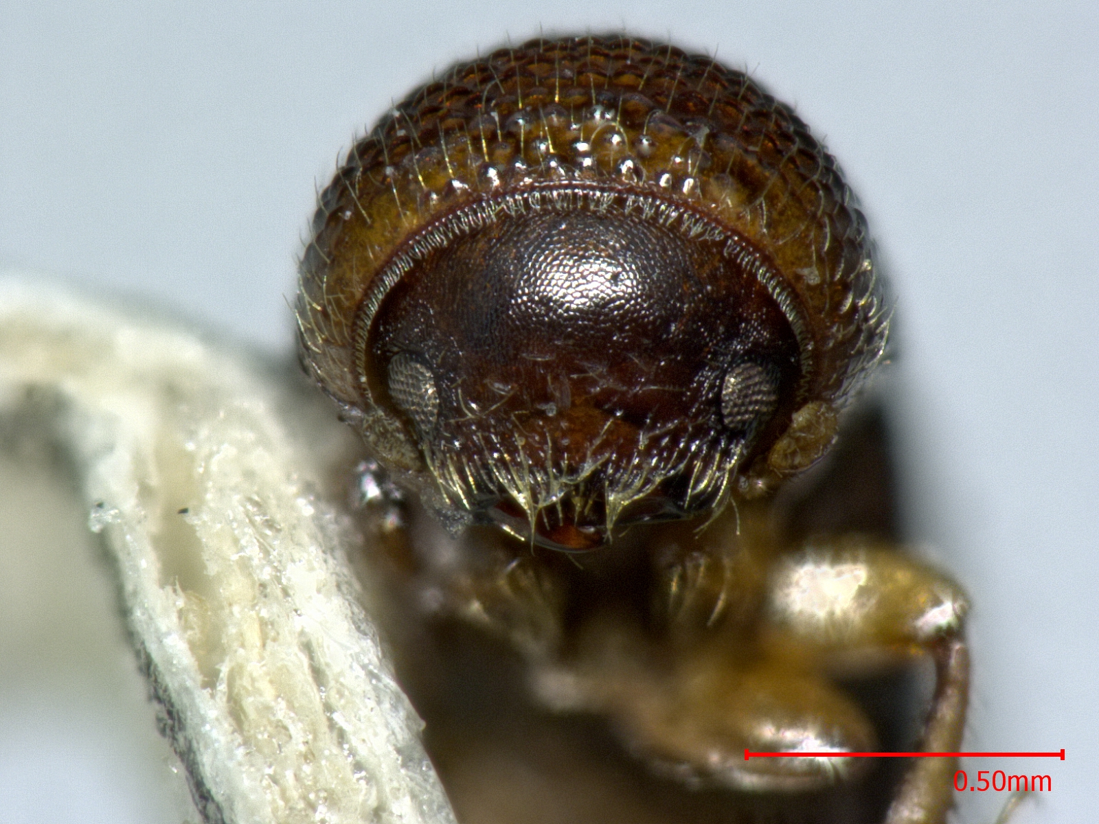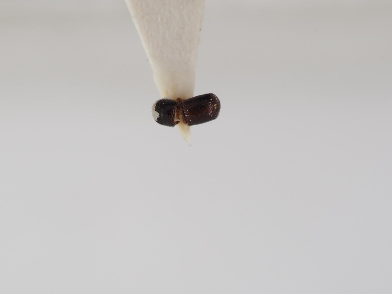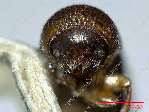 雌虫体长2.3亳米。体褐至黑祸色,体表光亮,翅后半部有细弱毛列。额面平,刻点下密上疏,均为纸小颗粒,因而整个额面比较粗糙,但仍旧光亮,额底面细网状,中龙骨位于额下部,根短,窄而低平,额毛较少。 前胸背板长略小于宽, 长宽比接近于L, 背面观前缘和前侧连合弓曲呈圆弧形,后偲平行;整个背板导方盾形,背中部最高,背板表面的瞵状瘤粗糙而稠密,前缘一排比较明晁, 刻点区表面有时略有谮皱,但底面光亮,不显细网状,没有背中线,背顶部前面的小瘤和后面的刻点常红成同心圆,环绕在顶部上,整个背葺毛疏短, 荫密后疏,分布正常。小盾片较大,呈圆三角形,平坦而光亮。 鞘翅长为前胸背板长的1.7倍,鞘翅表面平滑光亮; 刻点沟稍微凹陷,沟中刻点稍大于沟间部刻点,排列规则; 沟问部较宽阔,略降起,当中有一列细小稀疏的刻点; 鞘翅斜面正常,没有特殊构造,翅后部沟问部的刻点中心各生1根茸毛,排成毛列,翅后半部刻点沟中刻点不生茸毛。