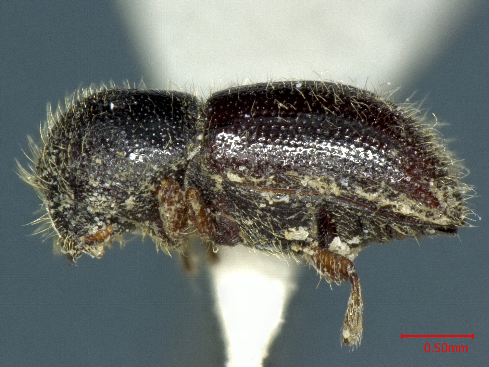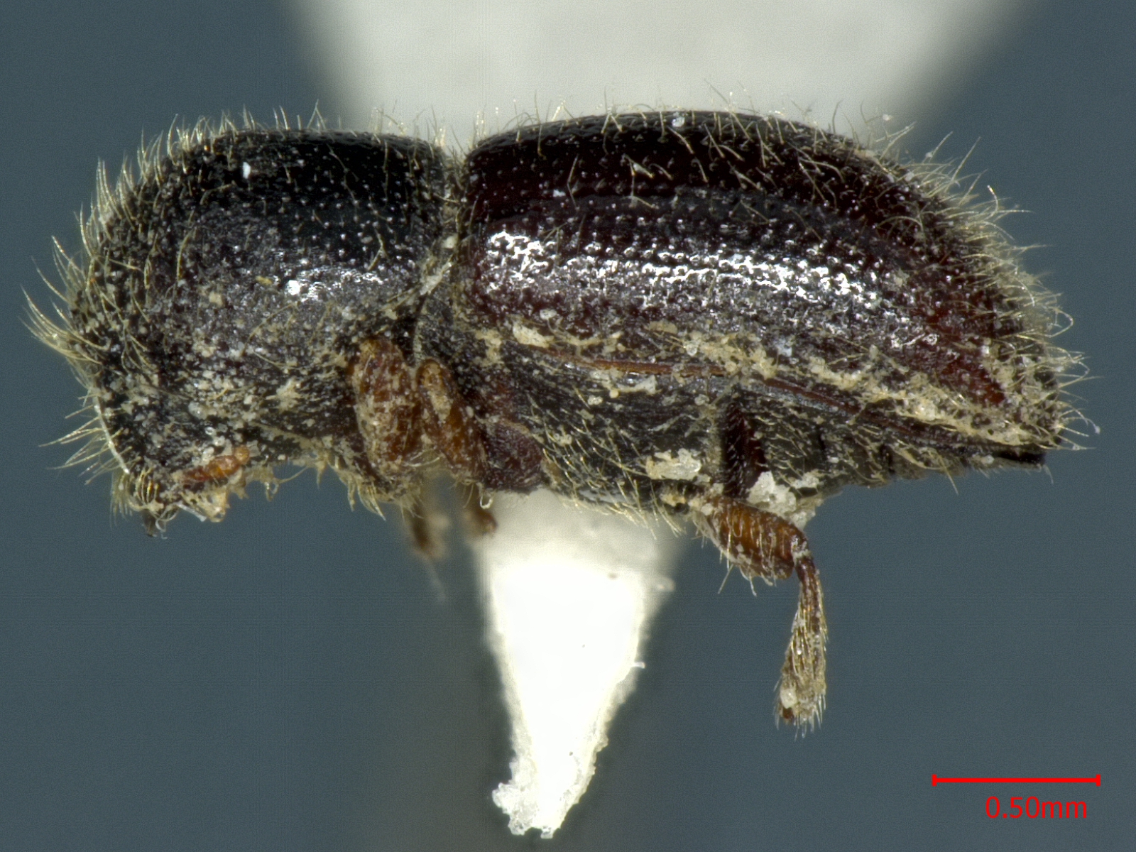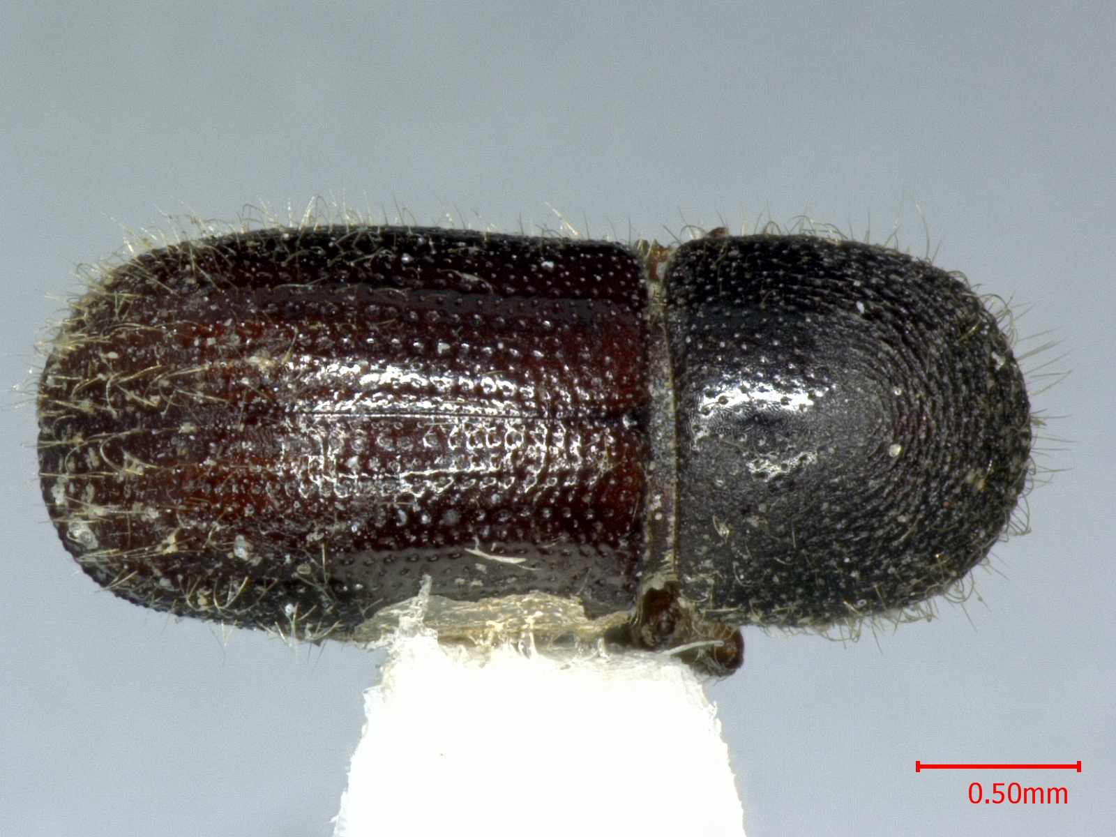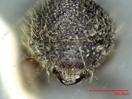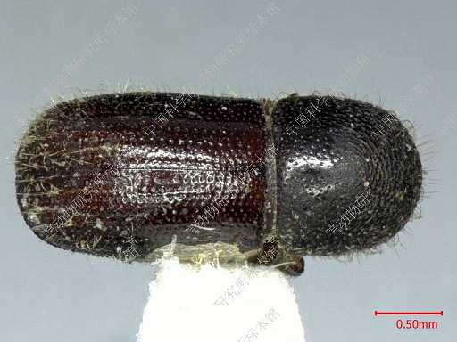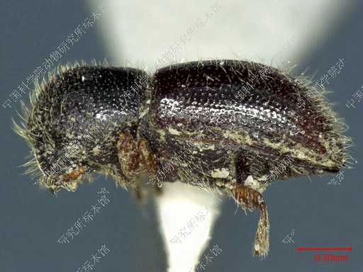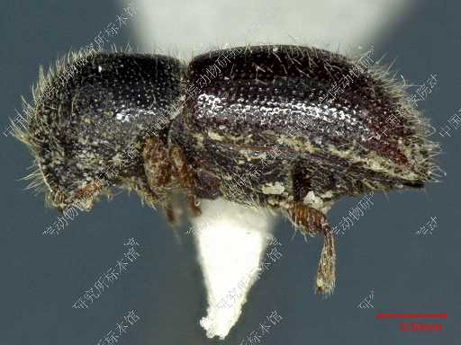 描述:雌虫:体长约3.2毫米。圆柱形,褐色至褐黑色,前胸背板较鞘翅色深,体表光泽适中,茸毛较多。眼肾形,较宽厚,眼前缘中部的缺刻浅阔而尖锐。触角锤状部圆形,共分三节,节间与毛缝同时存在于锤状部的里外两面,触角有散生长毛,发生在鞭节和锤状部的基节。额部平,底面有圆粒状的细密印纹,额面的刻点深大,形状不规整,密密麻麻遍太各处,没有中隆线;额毛起自刻点中心,细柔舒展,长短不齐。前胸背板长大于宽,长宽比为0.9;背面观整个轮廓呈短盾形;侧面观前1/2强烈上升,后1/2略许下倾,背顶部高而不突。瘤区和刻点区各占背板长度的一半,瘤区的颗瘤圆小稠密,瘤间空隙甚小,背板前缘上没有颗瘤。刻点区底面有粒状密纹,光泽晦暗,刻点圆大深陷,分布稠密,遍及全点区,背板有狭窄的无点背中线,时常不明显;背板的茸毛较多,瘤区较长,挺立而后曲,刻点区细柔短小,直向竖立。鞘翅长度为前胸背板长度的1.8倍,为两翅合宽的1.6倍;背面观鞘翅侧缘直向后伸,在翅长后1/4处开始收尾;侧面观鞘翅前2/3水平延伸,后1/3下降,有明显的斜面起点(图117:4),和下侧缘边。小盾片半圆形,光滑光亮。刻点沟轻陷,沟中刻点大小适中,圆形清晰,排成稠密径直的纵列;沟间部微隆,刻点圆小,在翅基部分布紊乱,以后各自成列,规则稠密。斜面上缘弓曲,斜面本身直下,翅缝及第1沟间部隆起,第1刻点沟下陷;自斜面前缘以后沟间刻点过渡成微粒;沟中刻点变平浅;鞘翅的茸毛起自刻点中心,沟中茸毛微小不明;沟间茸毛细长竖立,排成纵列,遍布全鞘翅。