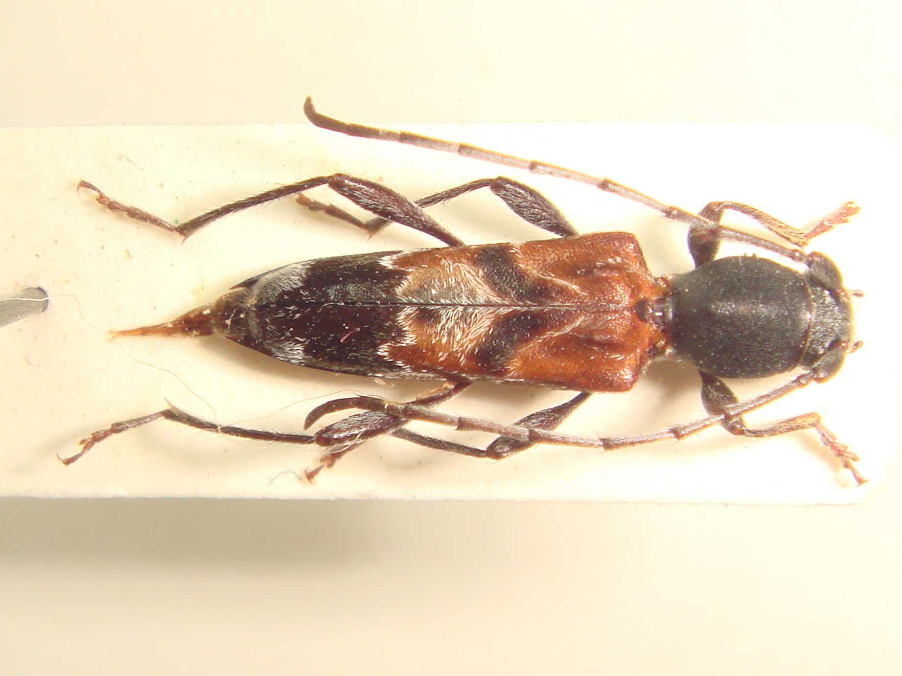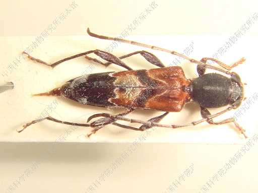 体长7.0–11.5毫米。体黑色及红褐色,具白色绒毛。头和前胸黑色,触角黑色具白绒毛。小盾片黑色。鞘翅基部五分之三红褐色,其中间具一条黑褐色斜带,斜带镶细的白绒毛边缘,斜带之后白绒毛较多,端部五分之二黑色,前端镶白绒毛边,波纹状,端部具白绒毛横斑。足黑色,具白绒毛。触角等于或略短于体长。鞘翅比前胸宽,向后稍狭窄,端部凹切,端缘角尖锐突出且尖端略朝内弯。腿节端部膨大,后足腿节不超过翅端。