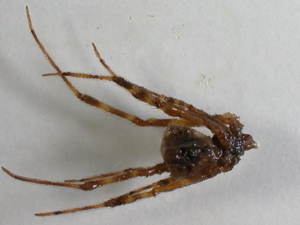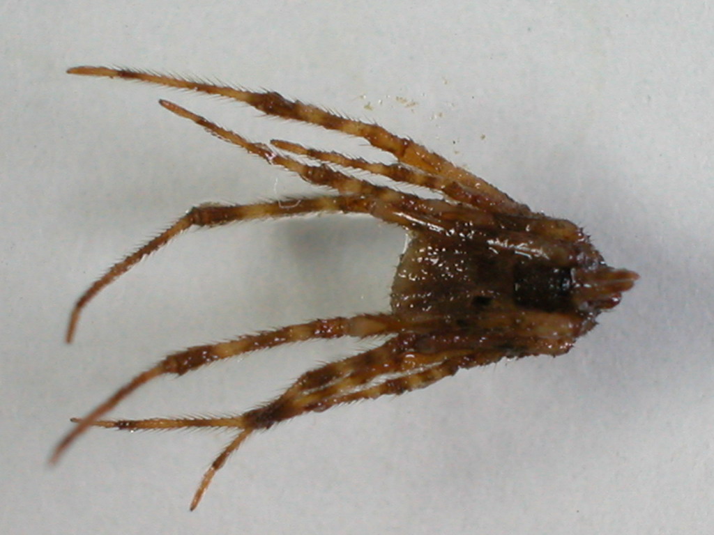 雌蛛体长4.80。头胸部长1.60,宽1.60;腹部长3.40,宽3.05,高3.50。背甲黑褐色,头部后半部颈沟内侧的中央有一“V”字形浅黑色斑,颈沟及放射沟黑色。中窝圆形,较浅,中央有一“V”字形刻痕。前眼列后凹,后眼列稍前凹。前中眼间距大于前中侧眼间距(0.13:0.05),后中眼间距大于后中侧眼间距(0.13:0.09),侧眼相接。中眼区长小于宽(0.34:0.35),前边大于后边(0.35:0.33)。前中眼>后中眼=后侧眼=前侧眼(0.11:0.10:0.10:0.10)。额高约为前中眼直径的3.5倍。螯肢黄色,前面内、外侧缘有黑褐色纵条,前齿堤有l齿,齿端分叉,后齿堤无齿。额叶、下唇及胸板黑褐色,颚叶的内半部,下唇的端部及胸板前半部的中央呈黄褐色。步足黄色,有明显的黑褐色环纹。足式:1,4,2,3。第一步足腿节长3.10,膝、胫节长2.90。腹部卵圆形。背面前半部黄褐色,有几条由黑色斑点组成的弧形带;后半部前端黄白色,散步小黑点,后半部后端的中央呈黑褐色,两侧为黄白色,亦散步黑色小点。腹部腹面黑褐色,生殖沟之后的正中央有一对很小的白色圆点,后半部有一弧形白色斑。纺器黄褐色,纺器基部的前面及两侧方围有黑褐环,该环之外又复围以白色环。外雌器在中部有一椭圆形陷窝。