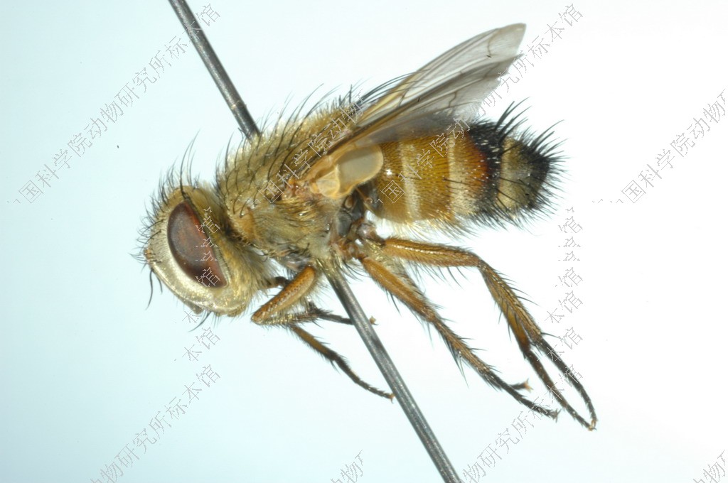 成虫体长11-13毫米。体红黄色,胸部背面全部被淡黄色长毛。腹侧后鬃3。腹部第3-5背板基部1/3各具1灰白粉带,第四和第五背板黑色。腿节淡黄色,前、中腿节端部各具1狭长的黑斑。侧颜几乎全部被白毛或黄白色毛,夜在靠近颜堤处有若干粗大黑毛。