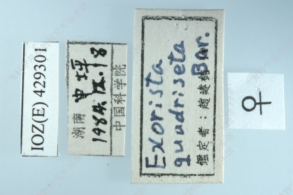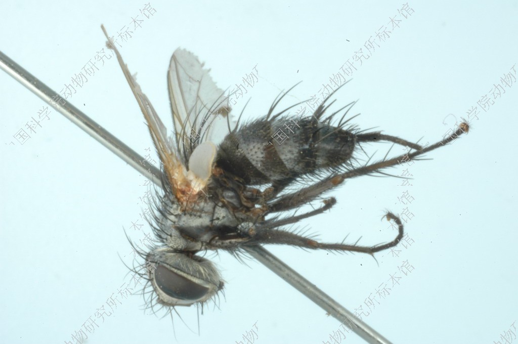 描述体大型,黑色,覆灰白色粉被。触角、足、翅肩鳞黑色;下颚须端半部、口上片、中颜板黄色;前缘基鳞棕黄色。中胸盾片具4个黑纵条,腹部背面具黑纵线,第3、4背板后缘具黑色宽带,下腋瓣白色,腹部两侧无黄色斑。雄性头部复眼裸,单眼鬃发达,着生于前后单眼之间,外侧额鬃缺如,内侧额鬃每侧2根,外顶鬃退化与眼后鬃无明显区别,前顶鬃缺如,后顶鬃每侧1根,在眼后鬃后方无黑色小鬃;间额两侧缘大致平行,中部的宽度等于侧额;额覆灰黄色粉被,额宽约与复眼的宽度相等;额鬃4根下降侧颜达触角芒着生部位水平,侧额毛下降侧颜至第1根额鬃下降之水平;侧颜裸,覆灰白色粉被,中部的宽度明显宽于触角第3节,触角第3节长为第2节的2倍,触角芒第2节不延长,第3节基部1/3加粗;髭着生于口缘上方,颜堤鬃分布于颜堤1/2长度以下,口缘平,中颜板具小颜脊,下颚须棒状,口盘发达,颏正常;后头稍拱起,被淡黄色毛,后头伸展区明显。胸部被黑色竖直的毛,中鬃3+3,背中鬃3+4,翅内鬃1+3,第1、2根翅上鬃之间具小的附加小鬃,腹侧片鬃2+1,翅侧片鬃2根;肩鬃4根,3根基鬃排成弧形,肩后鬃2根;前胸腹板被毛,前胸侧片凹陷处裸,后气门前肋裸;小盾片半圆形具竖直的毛,具4对缘鬃,1对心鬃,小盾端鬃交叉向上方伸展,与小盾片几乎垂直,两小盾亚端鬃之间的距离大于亚端鬃至同侧基鬃的距离,小于或等于两小盾心鬃的距离,小盾侧鬃每侧1根;翅r4+s脉基部具数根小鬃,前缘脉第2段腹面裸,第2段长等于第4段,前缘刺不明显,中脉心角为直角,末端具褶痕,心角在翅缘开放,心角至翅后缘的距离大于心角至中肘横脉的距离,端横脉基部稍向内凹入,rj脉裸,下腋瓣正常;前足爪发达,长于其第5分跗节,胫节具2根后鬃;中胫节具3根前背鬃,1根腹鬃,3根后背鬃;后胫节具2根背端鬃及数根前背鬃,基节后方裸。腹部毛倒伏状排列,腹基部凹陷达后缘,第1+2背板具1对中缘累,1根侧缘鬃;第3背板具中心鬃1对,中缘鬃4根,侧缘鬃1根,无侧心鬃;第4背板常具1对中心鬃,缘鬃1排,无侧心集,腹面两侧无密毛区;第5背板具缘鬃及心鬃各1行,腹面两侧无密毛区。肛尾叶长圆形,端部尖细,向腹面稍弯曲,背面具浓密的暗黄色长毛如刷状;侧尾叶宽。体长12-14mm。