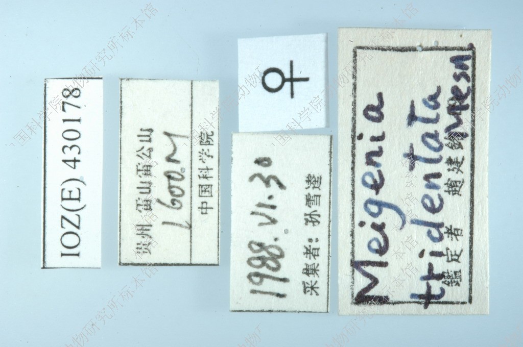 描述♂ 头部黑色,覆灰白色粉被,复眼被浓密长毛,其毛的长度约为单眼直径的2倍,额宽为复眼宽的3/7;间额前端显著宽于后端;在单眼三角前方与侧额等宽,侧额被黑毛,下降侧颜超过第1根额鬃,侧颜与触角第3节等宽,颜堤鬃3~4根,紧位于髭的上方;触角全黑色,第3节基部红黄色,其长为第2节的2.7倍;触角芒黑色,基部1/3加粗;额鬃下降侧颜达触角芒着生处水平,单眼鬃中等大小,向前方伸展,外顶鬃毛状,与眼后鬃无区别,外侧额鬃缺如;颊被竖立黑毛,颏长为其直径的2倍。胸部黑色,覆灰白色粉被,背面具5个黑纵条,中间3个在盾沟后方愈合,肩鬃3根,排列成一直线;前胸腹板被毛,中鬃3+3(4),背中鬃3+4,翅内鬃1+3,腹侧片鬃2+2;小盾片全部黑色,被竖立黑毛,具1对心鬃,4对缘鬃,小盾端鬃向上方伸展;翅淡褐色透明,翅肩鳞和前缘基鳞黑色,r4+5基部具3~5根小鬃,前缘脉第2段大于第4段;R5室开放,下腋瓣淡黄褐色,具淡黄色边缘;足黑色,前胫前背鬃1;后胫具1行长短不一的前背鬃。腹部黑色,两侧具不明显的红黄色斑,第1+2背板基部中央凹陷伸达后缘,各背板仅基半部覆浓厚的灰白色粉被,端半部黑色,沿背中线具1个黑纵条,第3、4背板沿背中线两侧的黑斑较大,三角形,内侧互相愈合,各具2对中心鬃,第5背板具心鬃和缘鬃各1行。肛尾叶黑色,纵裂分为2叶,端部瘦小,侧尾叶平直,被浓密的黑色长毛。