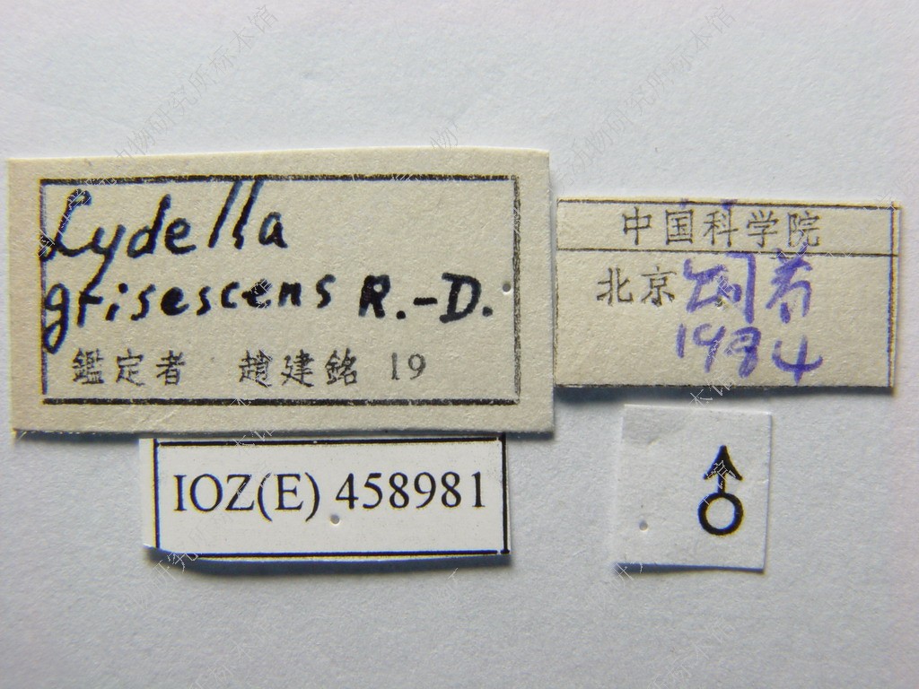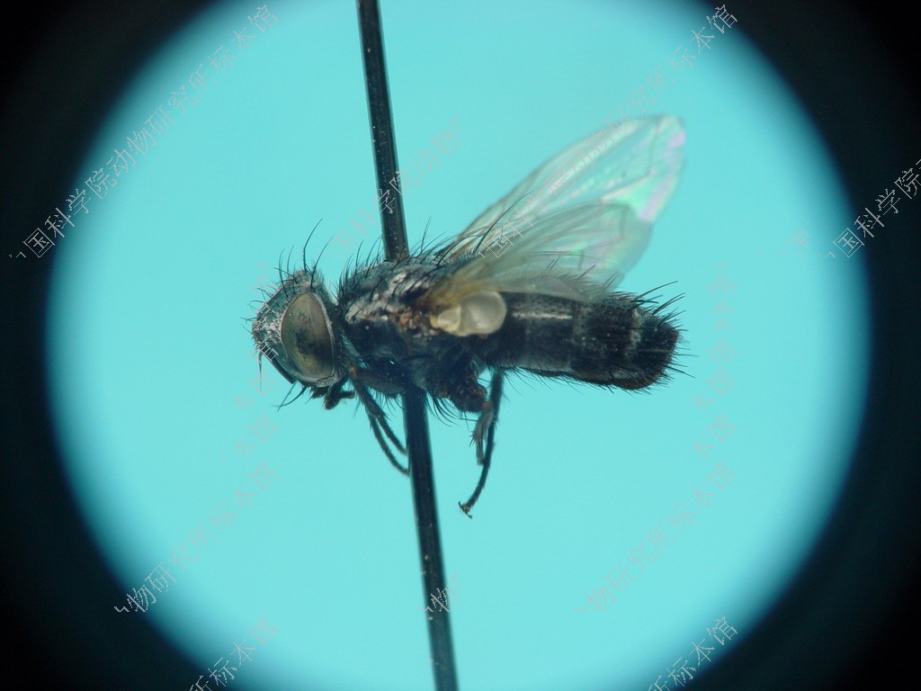 描述 ♂ 复眼裸,♀、♂额均为复眼宽的1.基3-1.5倍,间额棕褐色,两侧缘向后方加宽,间额0与侧额等宽,侧额黑色,覆灰白色粉被,额鬃2行,向头部背中线交叉排列,3-5根下降至侧颜,达触角第2节末端水平或触角芒的下方,内侧额鬃每侧2根,单眼鬃发达,向前方伸展,外顶鬃中等大小,后头拱起,黑色、覆灰白色粉被,在眼后鬃后方具1-2行黑色小鬃,侧颜黑色,覆浓厚的灰白色粉被、裸,窄于触角第3节,触角全黑色,第3节为第2节长的3倍,触角芒基部3/4加粗,颜堤鬃细小,分布颜堤基部1/2以下,颊宽等于触角着生处的侧颜宽度,口缘不明显突出,下颚须黑色。胸部黑色、覆灰白色粉被,背面具5个黑纵条,肩鬃4根,其中3根基鬃排成一直线,中鬃3+3,背中鬃3+4,翅内鬃1+3,翅前鬃小于第3翅上鬃,腹侧片鬃2+2,小盾片黑色、覆灰白色粉被,小盾端鬃竖立交叉排列,垂直于小盾片,小盾侧鬃每侧1根,两小盾亚端鬃的距离大于亚端鬃至同侧基鬃的距离,翅淡色透明,翅肩鳞和前缘基鳞黑色,R5室远离翅顶开放,中脉心角呈弧角,心角至翅缘的距离大致与心角至中肘横脉的距离相等,足全黑色,前足爪不发达,中胫具前背鬃、后背鬃各2根, 腹鬃1根,后胫具1行稀疏的前背鬃,其中1根较粗大。腹部长圆筒形、黑色,背中央具窄黑纵条,第2背板中央凹陷达后缘,具中缘鬃1对,第3-5背板基半部被浓厚的灰白色粉带,端半部具黑色横带,第3-4背板具中缘鬃和中心鬃各1对,第4背板两侧腹面具圆形密毛斑,第5背板具缘鬃和心鬃各1排。