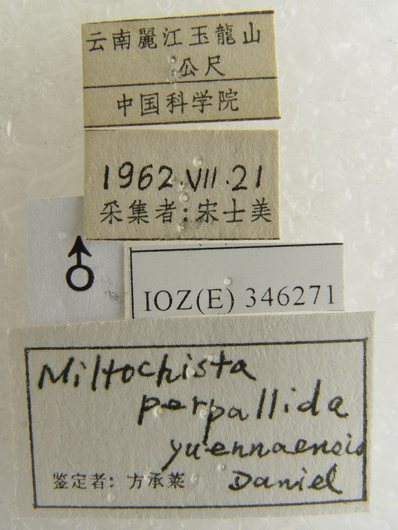 翅展雄40mm, 雌54mm。头、胸、前翅淡赭色, 下唇须黑色, 颈板染澄色, 腹部和后翅白色。 分布:锡金。 (1) 黄白美苔蛾云南亚种 Miltochrista (Barsina) perpallida yuennaensis Daniel 翅展36~46mm。前翅具有黑色基点1~2个, 前缘基部具黑边, 雄蛾翅脉及中室内纵带淡褐色, 翅反面翅顶区烟灰色, 内半前缘黑边明显。雌蛾翅脉不显。 分布:四川(峨眉山)、云南。