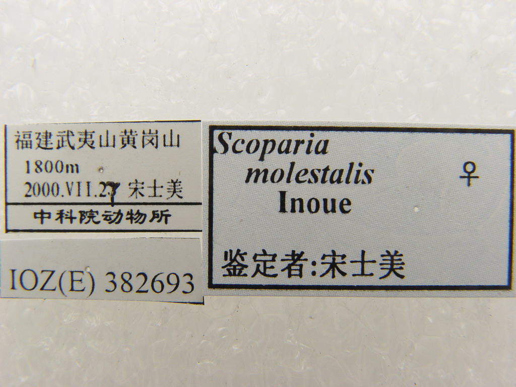 翅展20-22mm。头、下唇须及下颚须黑褐色;触角黄褐色;胸、腹部背面黑褐色。前翅黄褐色散布有黑色鳞片,翅基部前缘有1黑斑,内横线灰白色半圆形弯曲,外侧有黑色宽带,中室内及中室各有1黑斑,外横线灰白色,前段向外突出半圆形弯曲,后段平直,其内侧有黑边,前缘中部及顶角各有1黑斑,外缘有1排黑点。后翅及双翅缘毛淡褐色。雄性外生殖器:爪形突粗壮,端部细尖;颚形突细长;抱器瓣舌状,端部圆,腹缘有1短尖突;囊形突小钝圆;阳端基环新月形;阳茎粗壮筒状,端部有4枚刺状角状器。