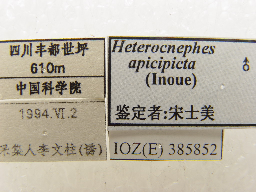 描述 翅展26-28mm。头白色,顶部暗灰色。下唇须灰褐色,基部及顶端白色;下颚须基部褐色,顶端白色;触角黄褐色。胸腹背暗灰色,腹部各节后缘白色,雄蛾肛毛白色。翅暗烟褐色,前翅前缘有1条白色细纵线,中室端脉纹黑褐色,翅顶有1长椭圆形黑色斑纹,斑纹后缘及翅外缘银白色。后翅前缘银白色,中室端有1暗褐色斑纹。双翅外缘线黑褐色,缘毛白色中部有1暗褐色线。雄性外生殖器:爪形突细长,端部膨大披短毛;匙形突矛形;抱器瓣宽圆方形,由基部向端部腹缘伸出弯曲尖钩突;抱器腹端部收缩变细,顶端钝;囊形突宽圆,基部细尖;阳端基环基部菱形,端部细长分叉;阳茎粗壮,内有1具刺穗状角状器。