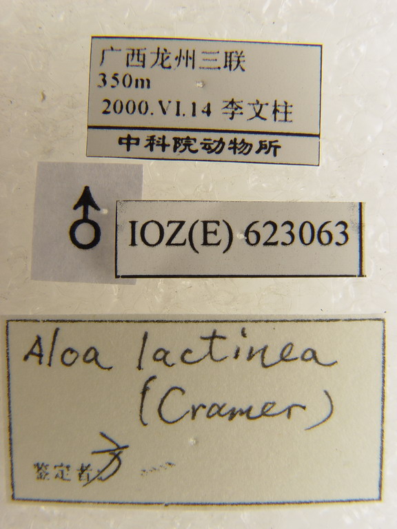 描述 翅展雄46~56mm, 雌52~64mm。白色, 雄蛾触角锯齿形, 下唇须红色、顶端黑色, 触角黑色, 头、颈、颈板边缘及肩角条带红色, 翅基片通常具黑点, 前足基节和腿节上方红色, 基节上具黑斑, 前足和中足胫节具黑条带, 跗节具黑带, 腹部背面除基部及肛毛簇外橙黄色, 腹面白色, 背面具黑色横带, 侧面具黑色纵带、亚侧面有一列黑点;前翅前缘具有红带, 中室上角通常具黑点;后翅横脉纹通常为新月形纹, 亚端点1~4个或缺如。