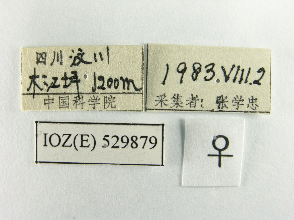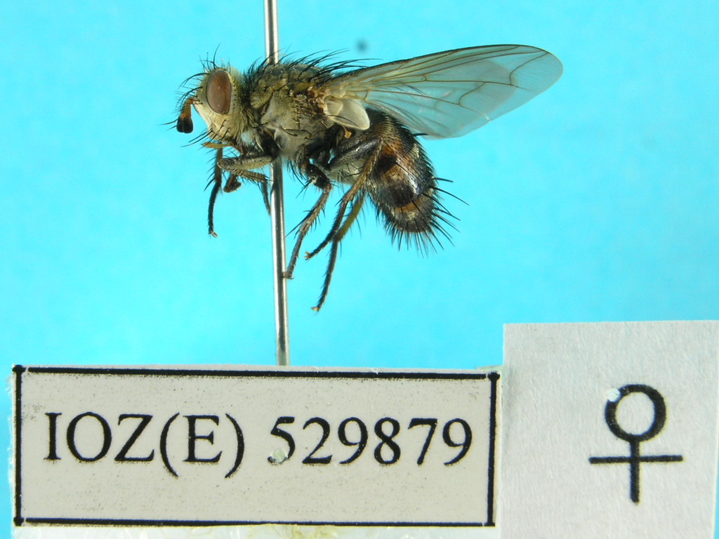 描述♀ 复眼被稀疏短毛,额略宽于复眼,间额红棕色,两侧缘向前方加宽,头部黑色,覆浓厚的灰黄色粉被,每侧额鬃1行6根,向头部背中线交叉排列,有3根下降至侧颜,前方1根下降不及触角第2节中部水平;侧额宽于间额、被黑毛,下降至侧颜与侧颜上的黑毛毗连;内侧额鬃2根,前方的1根较细小;外侧额鬃2根、粗大;前顶鬃缺如,单眼鬃发达,向前方伸展,后单眼鬃1对;外顶鬃粗大,后头略向后方拱起、黑色,覆浓厚的灰白色粉被,后头上半部无黑色小鬃,后顶鬃每侧1根;触角除第3节黑色外,基部2节红黄色,第3节略长于第2节,触角芒基部2/3加粗,第2节长为其宽的2.5倍;侧颜全部被黑毛,其宽度与触角第3节大致等宽,颊被淡黄色毛,具4-5根小黑鬃,颊宽大于复眼短轴的1/2,髭上方仅具颜堤鬃3根,下颚须红黄色,被黑毛;颏长为自身直径的3倍,唇瓣萎缩。胸部黑色,覆稀薄的灰白色粉被,被倒伏状小黑毛,肩胛覆浓厚的灰黄色粉被,肩鬃5-7根,肩后鬃2根,翅内鬃2+1,盾沟后第1翅内鬃缺如,背中鬃3+3,中鬃3+3,翅前鬃明显大于第3翅上鬃,腹侧片鬃1+1;小盾片黑色,小盾端鬃交叉向后方伸展,小盾侧鬃缺如;翅淡黄色透明,r4+5基部具4-5根小鬃,中脉心角呈直角、具褶痕;R5室在翅缘开放;端横脉向内凹陷;中脉心角至翅后缘的直线距离大于心角至中肘横脉的距离;足全部黑色,前足跗节不加宽,前胫具1行梳状前背鬃,后鬃2根;中胫前背面具长短不整齐的前背鬃1行,后背鬃4根,腹鬃2根。腹部卵圆形、黑色,第3-5背板基部1/2被灰白色粉被;第2背板无中缘鬃;第3背板具中缘鬃2根;第4背板具缘鬃1行;第5背板具缘鬃和心鬃各1行;腹面第1腹板及与其相毗连的第2背板内缘被黄白色毛,第6腹板长为第5腹板的1/3,红黄色,全部被黑毛,第7腹板为第6腹板长度的2/5,全部被黑毛。