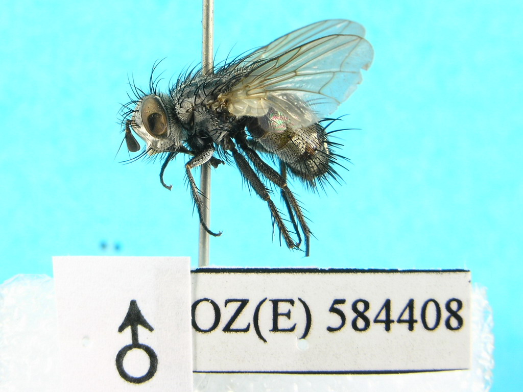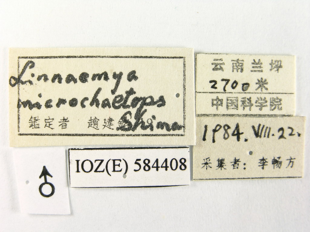 描述♂ 额较复眼略宽、每侧各具2根外侧额鬃;侧颜裸、较触角第3节窄0.3倍;颏较触角第3节长0.3-0.4倍,下颚须黑褐色,略短于触角第2节,触角黑褐色,第2节较第3节短1倍;头部前表面淡黄色,覆丝绸状灰白色粉被;单眼鬃发达,外顶鬃较眼后鬃大1倍多,眼后鬃粗壮。胸部黑褐色,被黑毛,覆灰色粉被;翅灰色透明,径脉主干上在与肩脉相对之处具5-6根小鬃;腿节紫黑色,前足爪略短于第5分跗节。腹部暗黑色,被黑色毛,第2-4背板两侧具红黄色花斑,第3-4背板各具2对中心鬃,第5背板被垂直的钉状鬃。