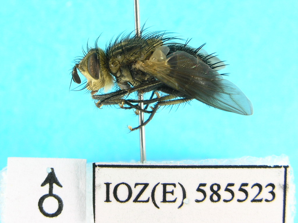 体长11mm。整个头部覆浓厚的金黄色粉被,额及侧额倍稀疏的黑毛,侧颜裸,颊被浓密的棕黑色长毛,仅在前部有2~3根细鬃,单眼鬃缺如,后头被金黄色毛。胸部黑褐色,肩胛红黄色,整个胸部覆浓厚的金黄粉被,背面具四个黑纵条;足除胫节淡黄色外,其余全部黑色;翅灰色透明,基部黄色;腹部黑,覆灰白色粉被,第2背板后半部到第4背板前半部的两侧具暗黄色花斑,第1腹板被暗黄色毛,腹部腹面其他部分被黑毛。