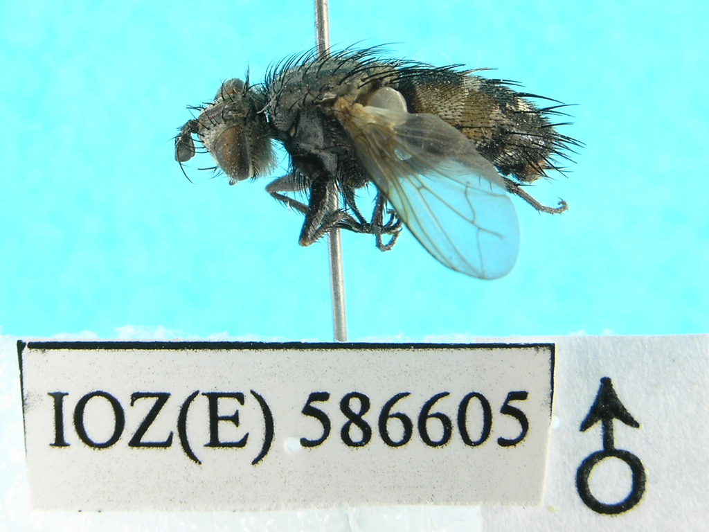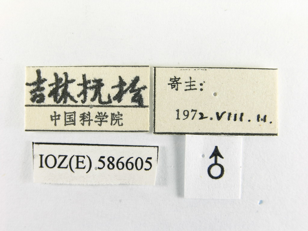 描述♂ 额较复眼略宽,侧颜裸,较触角第3节窄0.7倍;触角第3节较第2节长1倍,其宽度较其自身长小0.5倍,颊被粗鬃及稀疏的黑毛,单眼鬃极发达,较外顶鬃略长,外顶鬃几乎较眼后鬃大1倍,整个头部覆灰白色粉被。胸部黑褐色,小盾片红黄色,r4+5脉具7-8根小鬃,小鬃占基部脉段长度的2/5-1/2,中肘横脉与中脉心角接近,其间的距离较赘脉短1倍;前足爪与第5分跗节大致等长。腹部黑色,被黑毛,第3、4背板两侧具红黄色花斑,各具1对中心鬃,每侧各具1根侧心鬃。肛尾叶基部3/4较宽,沿背中线具细棱,端部1/4窄,两侧缘大致平行;侧尾叶长三角形,末端具2个小齿。