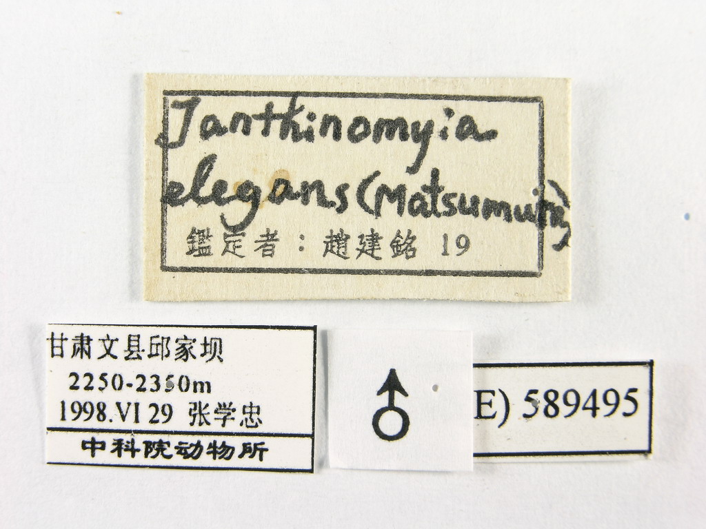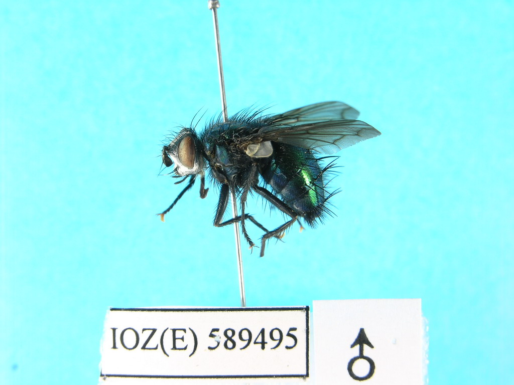 描述♂ 头部黑色,顶部轻度金属绿色,覆浓厚的银白色粉被;复眼被淡黄色密毛,额略窄于复眼的宽度,间额黑色,两侧缘向前方加宽,大致与侧额等宽;额鬃每侧8根、有2根下降至侧颜、最前方的1根达触角第2节中部水平;侧额被稀疏黑毛,伴随额鬃下降侧颜达同一部位;外侧额鬃1根,内侧额鬃缺如,前顶鬃存在;单眼鬃粗长,向前方伸展,外顶鬃中等大小,与眼后鬃明显相区别;后头黑色,轻度金属绿色,覆银白色粉被,显著拱起,上方在眼后鬃后方具2行小鬃(后方的1行较粗长);侧颜裸,其宽度大于触角第3节的宽度;触角全部黑色,第3节为第2节长度的2倍,触角芒裸,基部1/2加粗,第2节长度小于宽度;口缘显著向前方突出,颜堤下方仅具颜堤鬃2-4根;颊的后头伸展部发达,被黑毛,下颚须黑色。胸部金属绿色,覆稀薄的灰白色粉被;肩鬃4根,3根基鬃排成三角形,肩后鬃1根;中鬃3+3,背中鬃3+4,翅内鬃0+3,腹侧片鬃1+1,翅侧片鬃2根;前胸侧片凹陷处裸;小盾片金属绿色,小盾心鬃1对,小盾缘鬃4对,小盾侧鬃每侧1根;翅黑褐色半透明,翅肩鳞和前缘基鳞均黑色;r4+5基部具6根小鬃,R5室在翅缘开放,中脉心角为直角,心角至中肘横脉的距离为心角至翅缘直线距离的1.5倍;足全部黑色,前足爪长不及其第4、5分跗节长度的总和。腹部卵圆形,第1+2背板中央凹陷达后缘,无中缘鬃;第3背板具中缘鬃2根,中心鬃2对;第4、5背板各具缘鬃1行,中心鬃1对;第5腹板沿背中线纵裂为2侧叶,侧叶呈指形,相互远离,被黑色毛。