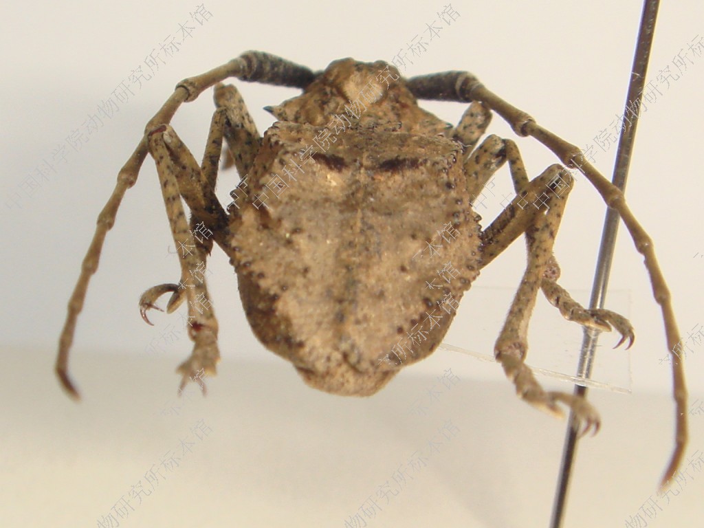 描述体长14.0-26.0毫米。全体暗褐色,被黄褐色细毛,腹面及足的腿胫节有不规则小黑斑。雄虫触角末3-6节超过体端,雌虫末1-3节超过体端;柄节粗,与第三节等长,长于第四节,表面上具刻点及浅皱,第三、四节近末端外侧下方有凹陷。前胸背板宽胜于长,表面具粗皱,中央隆起一巨瘤,表面凹凸不平,中线由浅穴状粗刻点形成,侧刺突基部肥宽,末端尖锐;鞘翅坚实,肩部较前胸狭,肩角不明显,左右鞘翅相合呈卵形,下部后方屋脊状倾斜,翅表散布棘状突起和小瘤突,棘状突主要沿肩部以下的棱脊上以及翅表自基部四分之一的中线上至倾斜部的顶脊上和倾斜面的边缘上。