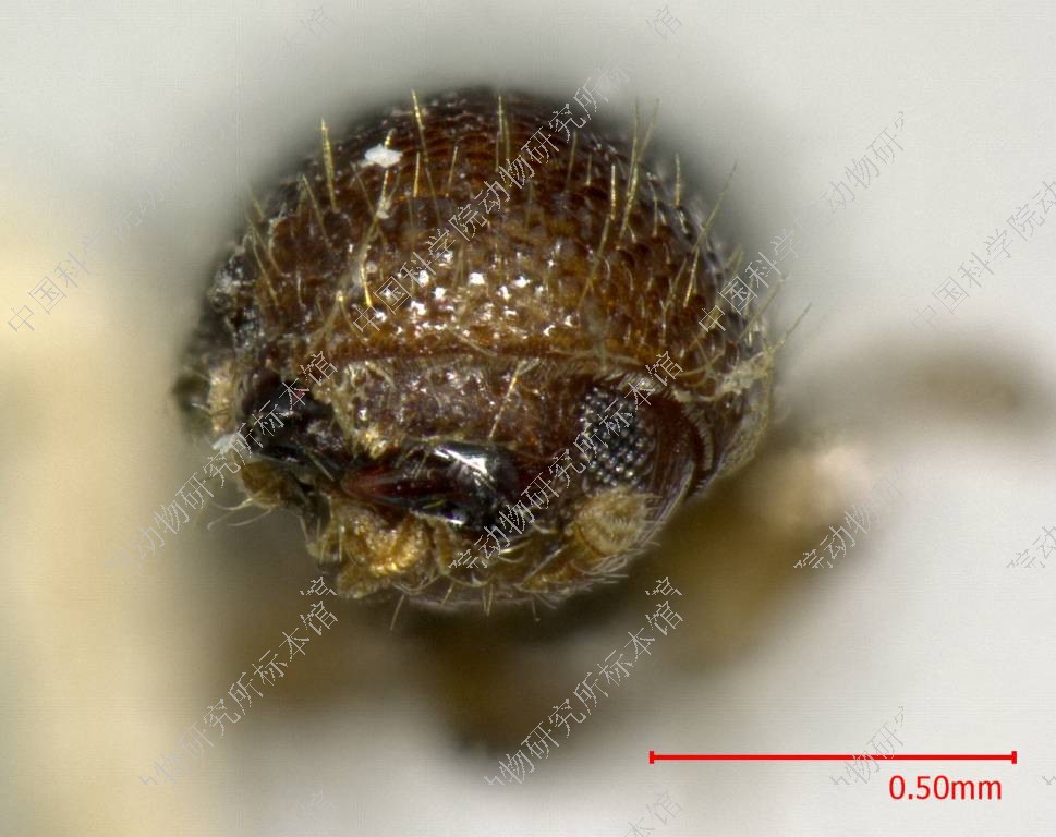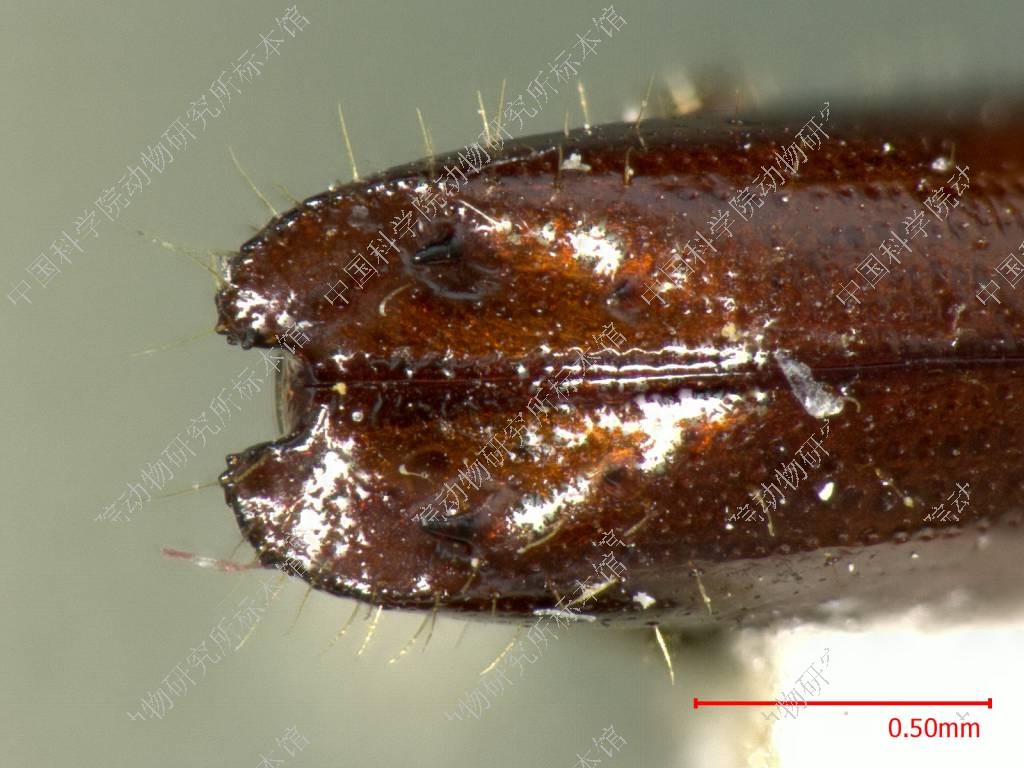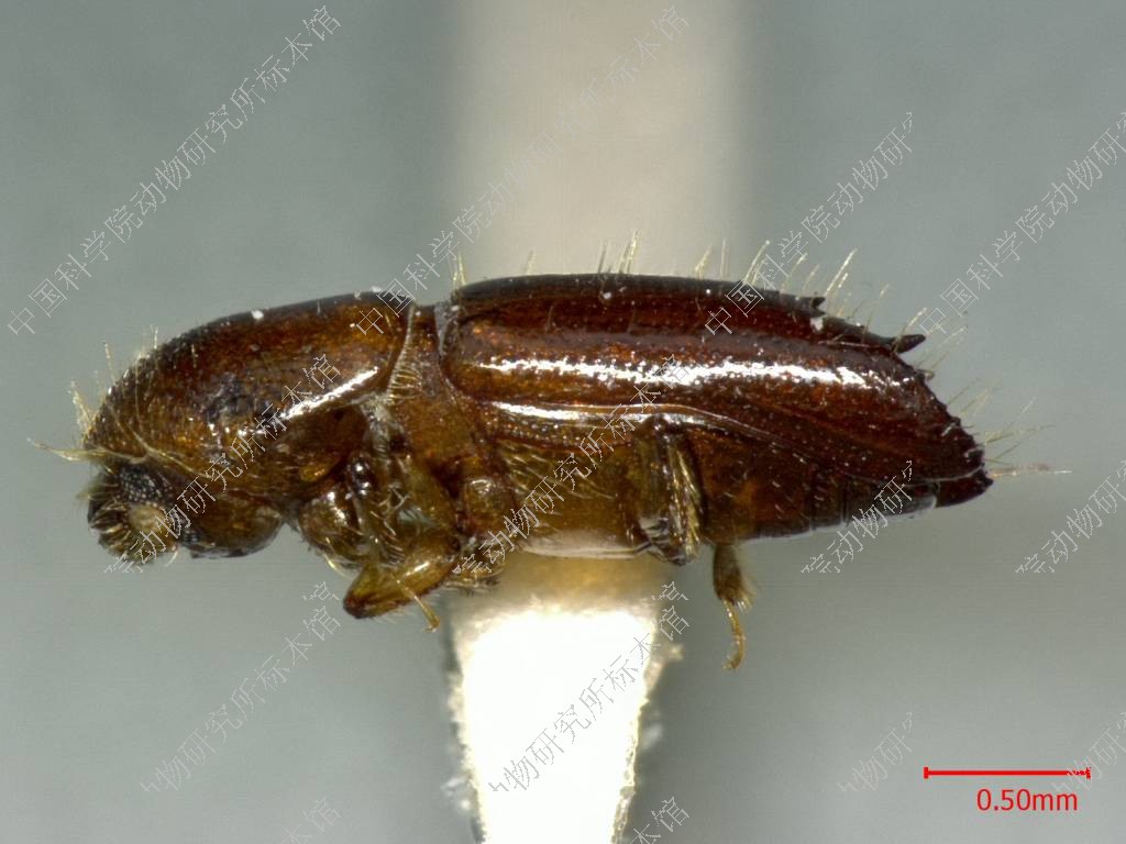 描述雌虫:体长约3.4毫米。长圆柱形,黑褐色,少毛,有强光泽。眼前缘的角形凹刻较浅。触角颜色浅褐。额部隆起,底面印有粒状密纹,额面的刻点深陷,大小不匀,密集在眼前缘附近,额面中部有无点的空白区,极其宽阔,中隆线经过空白区隐约地贯穿全额面;额毛金黄色,起自刻点中心,长短不齐,长毛竖立舒展,短毛柔弱匍匐,长短间杂,疏松地散布。前胸背板长大于宽,长宽比为1.2;背面观整个背板轮廓呈长盾形,背板两侧处平行伸展,没有突出的最大宽度;侧面观背板前部3/5弓曲上升,坡度平缓,为瘤区;后部2/5平直,为刻点区,背顶部在两区的交界处;瘤区的颗瘤低弱扁平,,前部与后部略有不同,前部的颗瘤略许疏散,大小间杂,后部的颗瘤稠密,形如鳞片,规则地平铺在板面上,止于背顶。刻点区的底面平滑无纹,刻点圆小深陷,粒粒清楚,它们以背顶为中心,排成同心圆弧,向后方刻点区层层扩散,刻点区有无点的纵中线;背板上的茸毛黄色,分布在背板瘤区的前部和背板两侧边缘上,刻点区中光秃无毛。鞘翅长度为前胸背板长度的1.8借,为两翅合宽的2倍;背面观背板基缘横直,两侧缘自基向端径直延伸,接近后端尾缘方始收缩,尾端翅缝处有一半圆形大凹刻;侧面观鞘翅前2/3水平延伸,又轻微弓突,后1/3开始下倾,成为斜面。小盾片长椭圆形,略微隆起,平滑光亮。刻点沟不凹陷由一列刻点组成,点形圆小轻浅,粒粒清晰,排成径直的纵列;沟间部平坦宽阔,有一列刻点,与沟中刻点大小一致,却较稀疏。鞘翅斜面开始于翅长后1/3处,由翅缝开始逐渐下陷,逐渐横向扩展,直达鞘翅尾端边缘,形成一桃形凹面,桃尖在斜面前缘,桃底在鞘翅尾端;鞘翅后半部有成对的颗粒,排在翅缝两侧,它们的形状由小渐大,从颗粒变成尖齿,它们的纵向距离由密渐疏,在斜面前部有1~3对不等,在斜面上共有三对,它们的横向距离由窄变宽,在斜面前,并列在翅缝两侧,在斜面上它们排在桃形凹面的两侧边缘上;凹面边缘上的三对齿中。第1对齿位于桃尖两侧,形状尖利,第2对齿位于桃面中部,最为强大,第3对齿位于桃底,在鞘翅半圆缺刻的两侧,形状圆小;另外在桃面边缘上还有两条点线将三个尖齿纵向串连起来,左右两侧,共计四条,此外,桃面平坦光亮,别无其它结构;鞘翅的茸毛疏少,颜色金黄,竖立舒展,分布在鞘翅后半部,斜面边缘及尖齿附近。