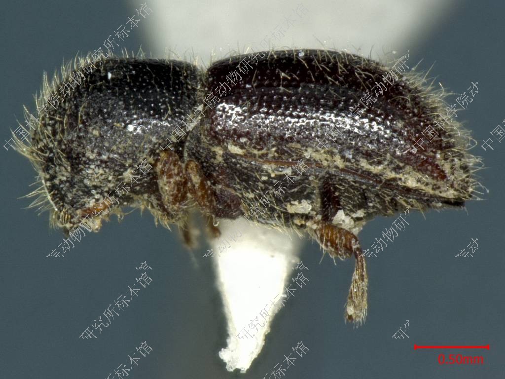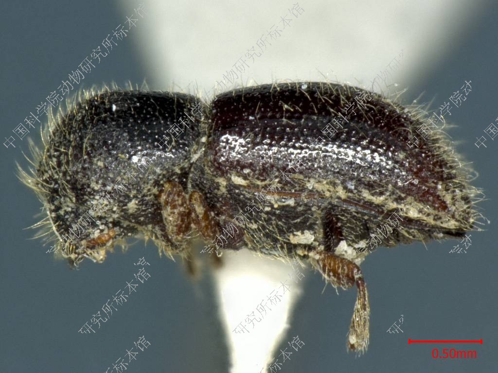描述 雌虫:体长约3.2毫米。圆柱形,褐色至褐黑色,前胸背板较鞘翅色深,体表光泽适中,茸毛较多。眼肾形,较宽厚,眼前缘中部的缺刻浅阔而尖锐。触角锤状部圆形,共分三节,节间与毛缝同时存在于锤状部的里外两面,触角有散生长毛,发生在鞭节和锤状部的基节。额部平,底面有圆粒状的细密印纹,额面的刻点深大,形状不规整,密密麻麻遍太各处,没有中隆线;额毛起自刻点中心,细柔舒展,长短不齐。前胸背板长大于宽,长宽比为0.9;背面观整个轮廓呈短盾形;侧面观前1/2强烈上升,后1/2略许下倾,背顶部高而不突。瘤区和刻点区各占背板长度的一半,瘤区的颗瘤圆小稠密,瘤间空隙甚小,背板前缘上没有颗瘤。刻点区底面有粒状密纹,光泽晦暗,刻点圆大深陷,分布稠密,遍及全点区,背板有狭窄的无点背中线,时常不明显;背板的茸毛较多,瘤区较长,挺立而后曲,刻点区细柔短小,直向竖立。鞘翅长度为前胸背板长度的1.8倍,为两翅合宽的1.6倍;背面观鞘翅侧缘直向后伸,在翅长后1/4处开始收尾;侧面观鞘翅前2/3水平延伸,后1/3下降,有明显的斜面起点(图117:4),和下侧缘边。小盾片半圆形,光滑光亮。刻点沟轻陷,沟中刻点大小适中,圆形清晰,排成稠密径直的纵列;沟间部微隆,刻点圆小,在翅基部分布紊乱,以后各自成列,规则稠密。斜面上缘弓曲,斜面本身直下,翅缝及第1沟间部隆起,第1刻点沟下陷;自斜面前缘以后沟间刻点过渡成微粒;沟中刻点变平浅;鞘翅的茸毛起自刻点中心,沟中茸毛微小不明;沟间茸毛细长竖立,排成纵列,遍布全鞘翅。