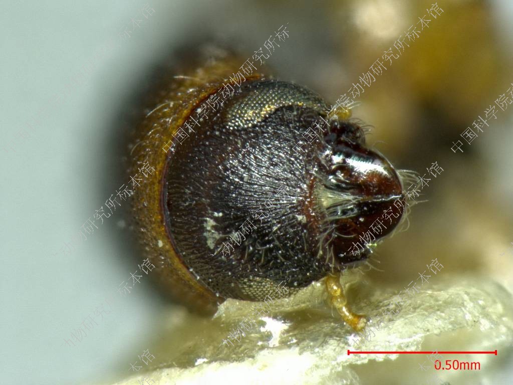体长 2.5-3.0毫米。前胸背板暗褐色,前缘和基部呈微红色;鞘翅褐红色,无光泽。雌虫的额部比雄虫平,两性的额部皆被有茸毛,但雌虫较少。鞘翅长于前胸背板,有浅黑色斑点或在中部有一条带。雌虫在第2腹节中央有一朝后的瘤状圆钝小齿,雄虫无。第3和第4腹节既无突起,又无膨大。两性的腹部皆被有短而竖起的茸毛。 分布 欧洲。