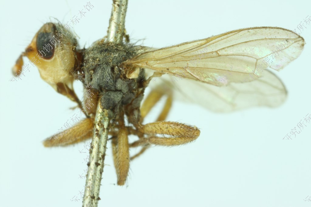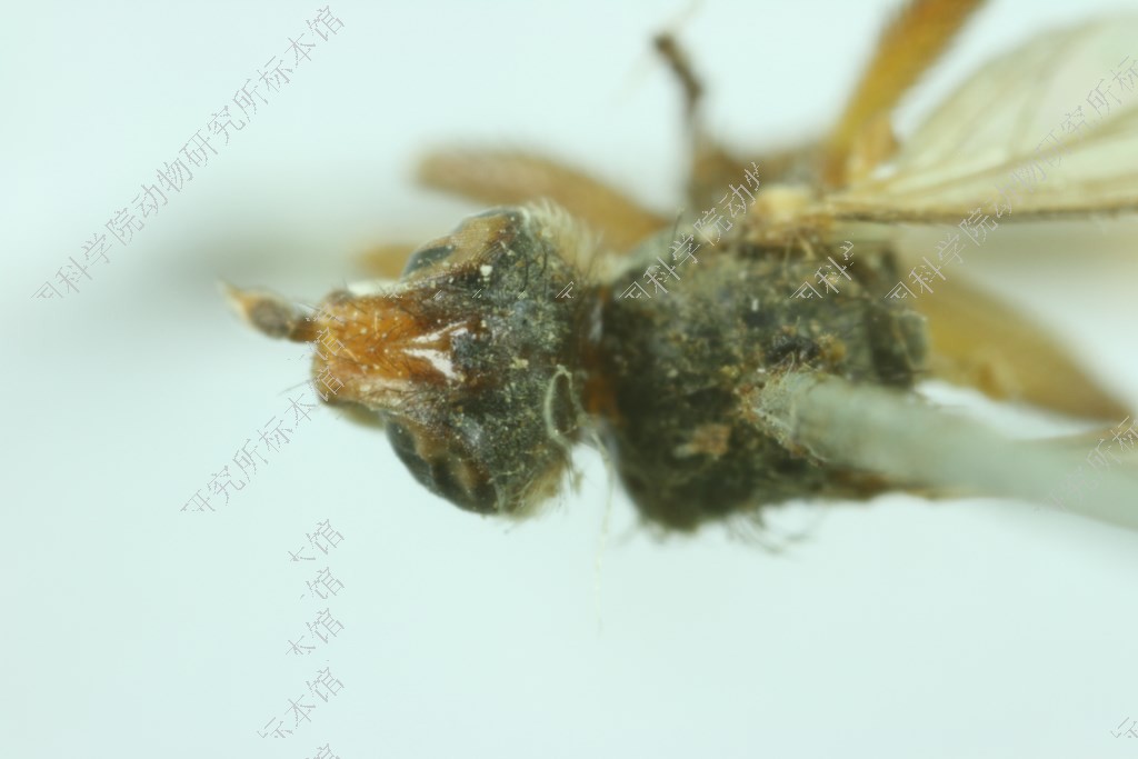 描述Espace interoculaire orangé en avant, brun-noir en arrière, à pilosité assez longue, modérément serrée. Face brillante. Joues jaunes, à pruinosité blanch?tre, un peu plus courtes que le plus grand diamètre de l'oeil. Antennes beaucoup plus courtes que la tête, premier article petit, brun-rouge; 2e jaune-brun, à pilosité courte, noire; 3e légèrement mais distinctement plus long que le 2e, noir à base roux-orange; chète rouge?tre, enfumé à l'apex. Trompe noire, dépassant à peine deux fois la longueur de la tête.