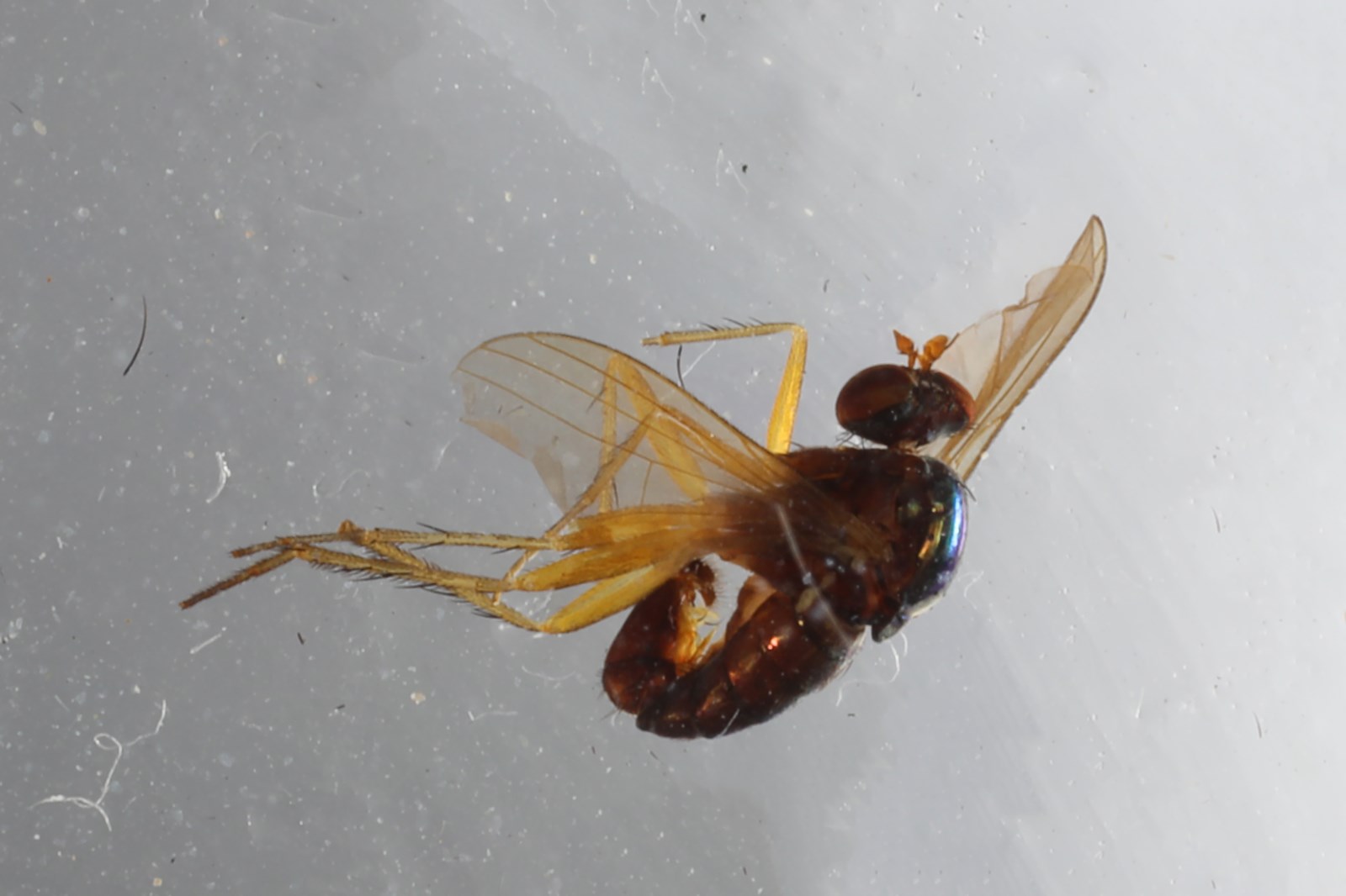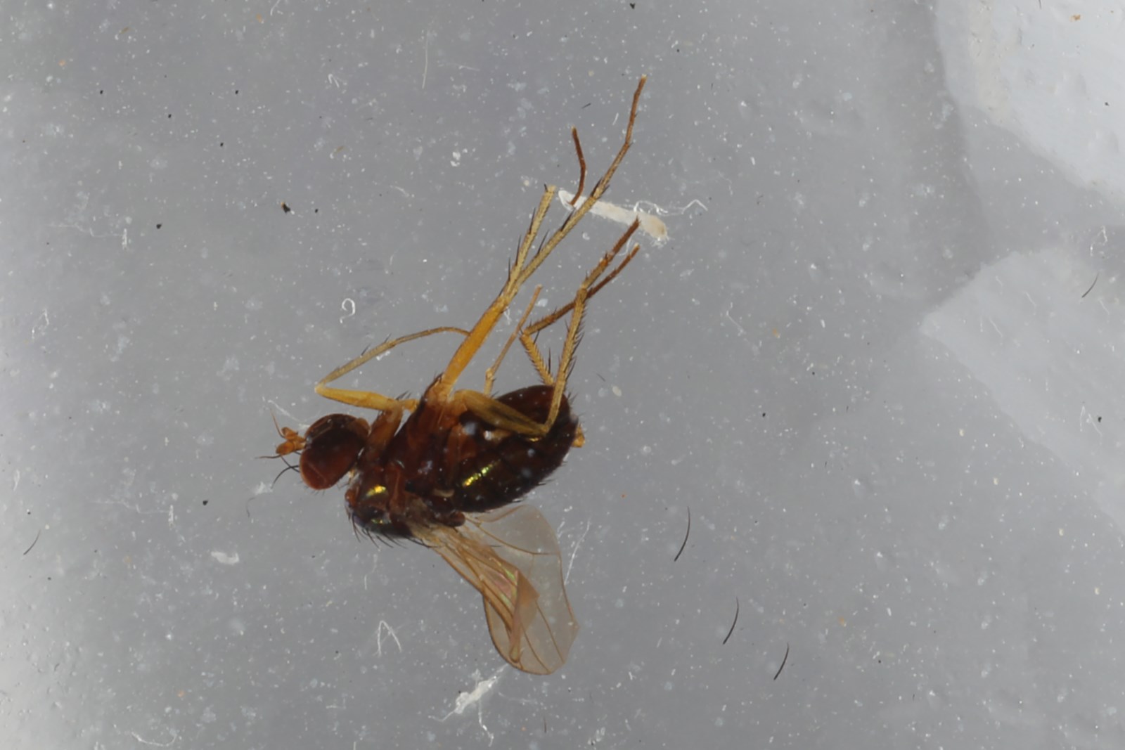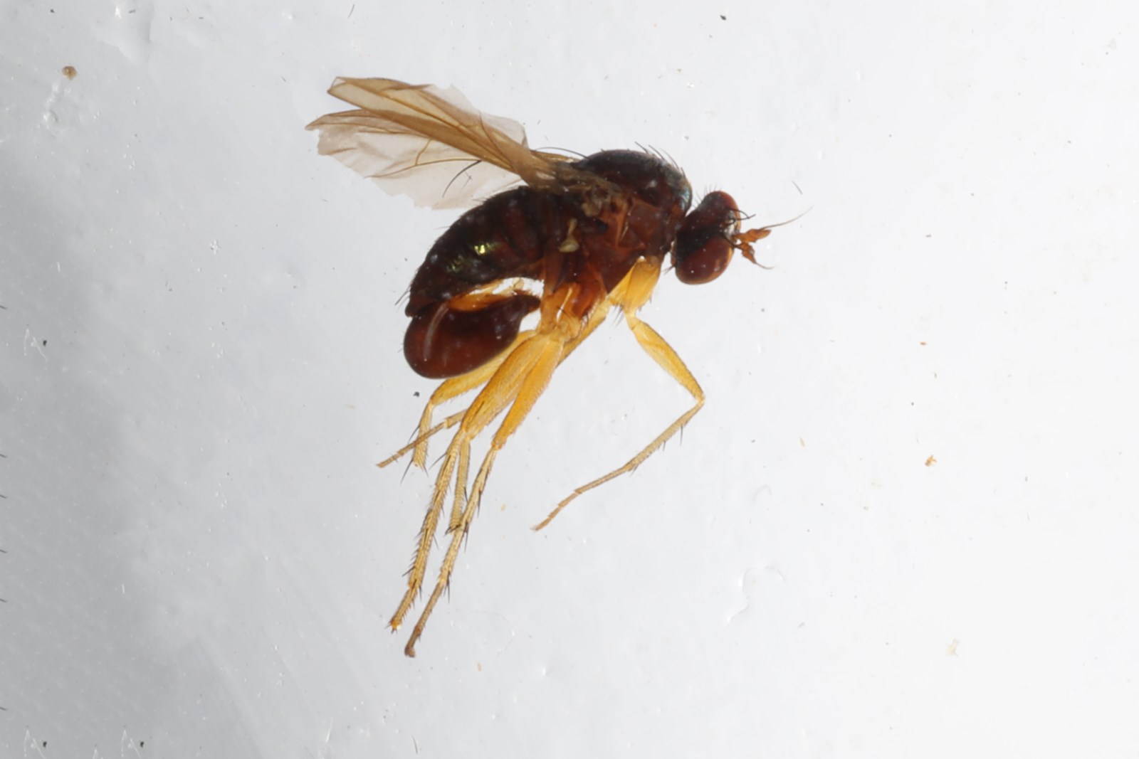 胸部金绿色,有灰白粉。毛和鬃黑色;8-9对不规则的短毛状中鬃;6根强背中鬃;小盾片背面和端缘有一些短毛。足黄色;基节浅黑色;跗节自基跗节末端往外褐色至暗褐色。足毛和鬃黑色;中后足基节各有1根鬃,中后足腿节各有1根端前鬃;前足胫节有1根前背鬃、2根后背鬃和1根长端腹鬃;中足胫节有3根前背鬃、2根后背鬃和1根前腹鬃;后足胫节有3根前背鬃、3-4根后背鬃和2根前腹鬃;后足基跗节基部有1根短腹鬃。足胫节和各跗节相对长度比 前足4.3 : 2.2 : 0.9 : 0.7 : 0.4 : 0.4;中足6.2 : 2.7 : 1.6 : 1.2 : 0.8 : 0.55;后足7.2 : 1.9 : 2.2 : 1.6 : 1.0 : 0.6。翅白色透明;脉黄褐色;R4+5与M端部弱的会聚,CuAx值0.7。腋瓣淡黄色,有黑毛。平衡棒黄色。