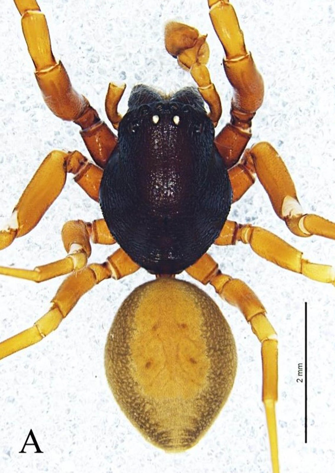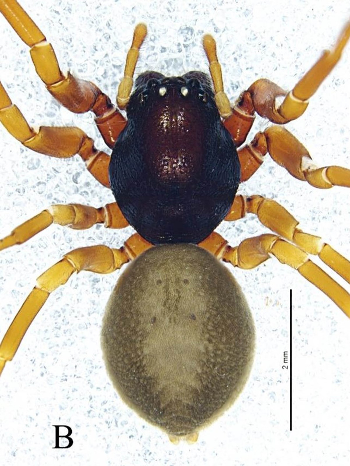 描述雄蛛(正模)体长5.13:背甲长2.57,宽1.90;腹部长2.46,宽1.87。眼的直径与测量:前中眼=前侧眼=后中眼=后侧眼0.15;前中眼间距0.06,前中侧眼间距0.12,后中眼间距0.19,后中侧眼间距0.26,前后侧眼间距0.21。中眼域:长0.35,前边宽0.34,后边宽0.45。背面观前眼列平直,后眼列后凹。额高0.11。螯肢前齿堤3齿,后齿堤5齿。步足测量:步足I6.82(2.00,0.91,1.68,1.41,0.82),II6.24(1.82,0.79,1.50,1.32,0.81),III4.58(1.33,0.59,0.95,1.15,0.56),IV5.94(1.69,0.68,1.32,1.59,0.66)。足式:4123。步足I–II胫节和后跗节腹面具尖点。腹部背面具背盾,浅黄褐色,宽度约为腹宽的1/2,长度约为腹长的2/3。