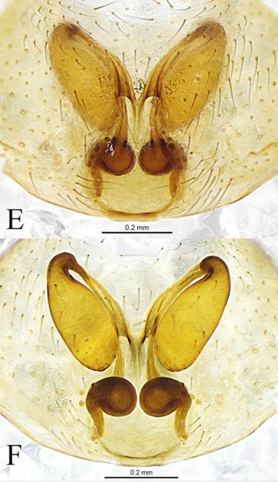 1雌蛛体长5.17:背甲长2.38,宽1.88;腹部长2.79,宽2.20。眼的直径与测量:前中眼=前侧眼0.16,后中眼=后侧眼0.15;前中眼间距0.06,前中侧眼间距0.09,后中眼间距0.20,后中侧眼间距0.22,前后侧眼间距0.17。中眼域:长0.37,前边宽0.34,后边宽0.47。额高0.12。步足测量:步足I6.82(2.00,0.91,1.68,1.41,0.82),II6.24(1.82,0.79,1.50,1.32,0.81),III4.58(1.33,0.59,0.95,1.15,0.56),IV5.94(1.69,0.68,1.32,1.59,0.66)。足式:4123。步足无刺和尖点。腹部背面无背盾,后部具数个模糊的浅色“人”字形斑纹。外雌板前庭后位,宽于纳精囊外侧缘距离;插入孔喇叭状,中位,相互靠近。交配管略弯曲,长度超过连接管长度的一半;黏液囊长卵形,前端强烈弯曲,后端靠近纳精囊,表面具腺孔;纳精囊球形,后位,相互靠近。