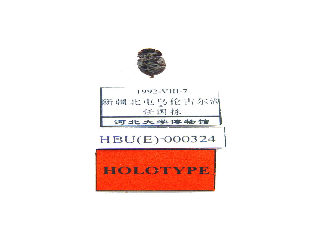 描述体长椭圆形,棕褐至褐色,背面无光泽或有弱光泽,腹面光泽较强。唇基前缘三角形深凹,额唇基缝隆起;颊弯曲,向外明显扩展,边上翘;上唇短小,前缘内弯,两侧有毛束;背面有稀疏圆形粒突;下颚须末端扁,略呈斧状。触角短,向后不达前胸背板中部,第3节几乎与第2节相等,端部5节呈棍棒状扩大,各节长度之比从基部到端部依次为10: 3.1: 3.0: 3.8: 2.0: 2.0: 2.0: 2.9: 3.0: 2.5: 4.1。前胸背板横宽,宽大于长3.7倍;前缘中央较直,两侧弯向前方;侧缘圆弧形,有22~25枚细齿;基部宽圆弧弯,两侧有细饰边;背板前缘和基部有金黄色毛列,侧缘有稀疏长毛;前角钝,后角宽圆弧形;盘区拱起,密被扁平三角形瘤突,在侧区显得更密。鞘翅极度隆起,长大于宽1.3倍,肩圆弧形,较前胸基部窄,中部偏后处最宽;翅缝低陷,翅面的刻点行可辨,行间较隆起,有稀疏而不规则横皱纹,皱纹之间形成大小不一的扁块状突起,并杂以少量的具毛粒突;背面毛短,侧区毛长。前足胫节内缘弯曲,外缘的中齿直立,端齿阔三角形,前缘直,其外侧中部有1三角形凹坑;中、后足胫节端部向外明显扩大并弯曲,外缘细锯齿状,着生锥状短毛,胫节腹面中央凹槽状,后足末跗节显长于第1跗节,长度比15: 11。整个腹面有稀疏长毛;腹部第1~3节腹板有纵皱纹;末节阔三角形,扁平,有小瘤突。阳茎粗短,长宽之比为4.5: 2.1,基板与基侧突长度之比为2.1: 1.9;基板两侧平行,基侧突向端部逐渐变细,顶尖。