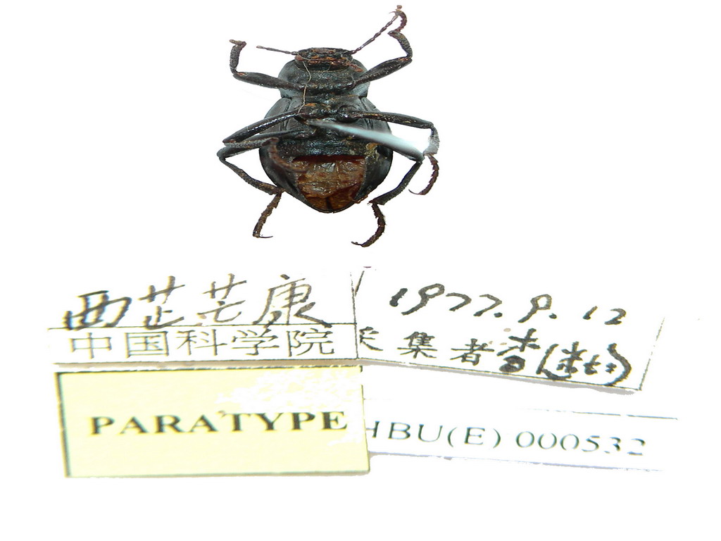 体黑色,略发亮。 上唇长方形,前缘近直,有金色毛;唇基前缘弧凹,两侧有钝角形凹陷;眼不突出,其侧缘是头部的最宽处;头盘平坦,有稠密刻点。触角向后向后长达前胸背板基部,第2-7节圆柱形,第8-10节球形,未节尖卵形,端部4节密有短毛和稀疏长毛;第2-11节的长(宽)之比为:0.6(0.6),2.0(0.6),0.9(0.5),0.8(0.5),0.8(0.5),0.9(0.5),0.6(0.6),0.6(0.6),0.6(0.6),1.1(0.7)。颏椭圆形,前缘较直。 图198 长角小琵甲 Gnaptorina longicornis Li et Ren A. 头部 (head); B. 前胸背板 (pronotum); C. 触角 (antenna); D. 前足腿节 (profemur); E. 前足胫节 (protibia); F. 后足胫节 (metatibia); G. 后足跗节 (metatarsus) 前胸背板横方形,宽大于长1.2倍,是头部宽的1.7倍;前缘弧凹,饰边不完整;侧缘中间最宽;基部直截;前角钝角形,后角近直角形;盘区有稠密的小刻点。前胸侧板粗糙,有明显纵皱纹。前胸腹突具中沟,向后均匀降落。小盾片不明显。 鞘翅尖卵形,长大于宽1.6倍,是前胸背板宽的1.5倍,中部最宽;盘密布皱纹;侧缘饰边由盘仅见基部1/3;假缘折向翅尾均匀收缩。腹部可见腹板光亮,有细皱纹。 足粗壮,腿节棒状,所有胫节较长(宽)之比依次为:7.6(1.0),7.5(1.2),11.0(1.5)。前足腿节和胫节端部有缺刻,胫节端部宽弯,端距粗扁,前足跗节下侧有刚毛刷。后足胫节直,向端部均匀变宽;后足端距扁阔;第1-4跗节较长之比依次为:2.6,1.4,1.4,2.5。 阳茎基板长于阳基侧突2.1倍,阳基侧突向端部均匀变尖,长大于宽2.6倍。 ♀:身体显宽于♂。触角较短。前足内端距发达,扁指状,基跗节下侧无毛刷或毛束。后足胫节直。其余特征同♂。 体长:♂ 13.1-14.5 mm,♀: 13.3-15.1 mm;宽:♂ 4.9-5.5 mm,5.6-6.1 mm。