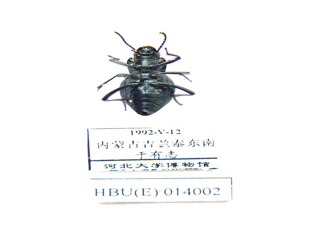描述体细长;亮黑色。头较粗,比前胸背板窄,背面刻点不太明显:触角倒数第2节几乎不变宽。前胸背板宽大于长,近心形,刻点简单且不易区分:两侧中部之前圆形,前缘饰边较宽,饰边线近于不明显,基部较圆,无饰边:前角较直的变弯,后角略尖并弱后突。鞘翅卵形,细长,基部有完整细饰边,两侧向端部渐变尖,有较独立的短翅尾;翅面向上均匀而急剧地的隆起,中部之前最宽。前胸侧板有非常简单或微锉状刻点,有时近于完全光滑:前胸腹突向后阔伸,端部不下弯:中胸腹板刻点稠密近于汇合;腹部近平滑。雄性前足和腿节内侧有淡色刻点组成的感觉器条纹。