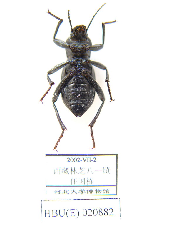 体卵形,黑色,弱光亮。 ♂上唇椭圆形,前缘浅凹入,被棕色短毛;唇基前缘平直,两侧角略前伸,细刻点稠密;头顶有压痕,圆刻点稠密。触角向后长达前胸背板基部;第2-7节圆柱形,密布感觉毛,第3节长于第4节2.0倍,4-7节近等长,第8-10节椭圆形,末节略尖卵形,端4节端半部具稠密短毛和少量长毛;第2-11节长(宽)比为:2.5(4.0), 11.0 (3.5), 5.5(3.5), 5.0(3.5), 5.0(3.0), 3.0(6.0), 4.0(5.0), 4.0(5.0), 4.0(5.5), 5.5(5.0)。颏小,椭圆形。 前胸背板近方形,宽大于长1.6倍,前缘、最宽处、基部较宽度比为:2.6, 3.9, 3.4;前缘略凹,饰边宽断;侧缘端2/3处最宽,向前浅凹、向后斜直收缩,饰边完整;基部直,两侧略后伸,粗饰边中断;前角圆钝,后角近直角形;盘区拱起,刻点稠密。前胸侧板外侧皱纹细,内侧皱纹粗夹杂少量小颗粒;前胸腹突粗糙,中沟深,垂直下折,端部扩展,与中胸接触。小盾片隐藏。 鞘翅长卵形,长大于宽1.8倍;基部宽于前胸背板基部;侧缘近平行,端1/3处最宽,饰边完整,背观仅见基部和端部饰边;盘区平坦,皱纹细而均匀,杂有后伸的尖锐小粒突;翅坡降落,翅尾极短或不明显;假缘折从第2可见腹板处向后急剧收缩,细短纹。腹部光亮,第1-3可见腹板细纹稠密,端部2节细刻点稠密;第1、2可见腹板间毛刷棕色。 前足腿节棍棒状;胫节下侧刺突稠密;中、后足胫节棕色刺状毛稠密;各胫节端部及跗节红棕色,胫端距较短,跗节密布棕色毛;后足第1跗节不对称,略长于第2+3节,第1-4节长(宽)比为:19.0(7.5), 9.0(7.0), 8.0(6.0), 19.0(7.0)。 体长:♂ 15.5-17.0 mm,♀ 16.5-19.0 mm;宽:♂ 6.5-7.5 mm,♀ 8.0-10.0 mm。 ♀:体更宽,无翅尾,余特征同♂。
