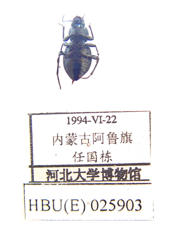 体长8.0~- -9.1mm,宽3.1~3.9mm。 尖卵形:黑色。头背中间有长方形深凹,刻点圆,后颊为皱纹:唇基两侧和前颊向眼圆弧形弯曲,后颊向后较直收缩:额唇基缝两侧清晰:触角较粗,第8~10节三角形,未节扁卵形,端部4节上侧有淡色毛区。前胸背板横阔,盘区高隆,中线明显,刻点棱形并交错成网状,两侧卵形双重刻点稠密:前缘弱凹,饰边中断:侧缘圆弧形弯曲,中基部较急收缩,饰边明显:基部中叶直,两侧弯曲,饰边中断:前角钝直,后角近圆。鞘翅基部饰边抛线状伸向肩角,肩钝角形向前突:侧缘长圆弯曲,前面3/8处最宽:盘拱起,有稠密半圆形具毛浅刻点,隐约可见4条纵脊。前胸侧板中部和外侧有木锉状刻点:腹部有具毛浅圆刻点,第2~4节中部不清晰,两侧密,肛节中央微凹。前胫节短直,内侧粗糙,端部粗,内端距长于外端距。