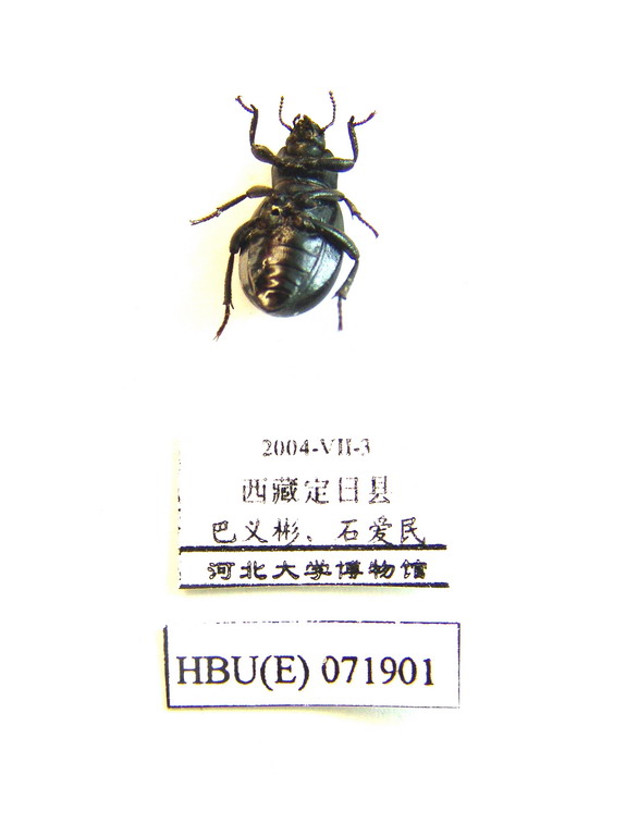 体色:身体略带光泽,触角和足黑色。 雄性 头部:唇基前缘微弧凹;前颊于眼前平行;眼不突出于后前颊;触角基部上方的头侧凹弱凹;唇基缝斜而整齐;头部刻点稠密、细小、光滑。 胸部:前胸背板宽为长1.2倍,宽为头1.7倍;前缘平直;侧缘中间之前最宽,前2/3向外弧凸,基1/3浅凹,前缘、最宽处和基部宽度比为6.2: 10.0:9.6;基部平直;前角钝角端圆,后角直角;盘区平缓隆起,基部1/4有微刻痕和粗糙的细浅点。前胸侧板有光滑的不规则皱纹。前足基节后方的腹突降落。 鞘翅:长卵形,长为宽1.4倍,中部之后最宽,宽为前胸背板1.5倍;由背面可见缘折侧缘前1/3,盘区平缓隆起,有细皱纹和大小均匀的点;假缘折上有同样的细皱纹;翅宽为假缘折宽4.2倍。 腹部:整个可见腹板有浅的细皱纹。 足:前足胫节较细,端部3/4平行,端部有1大型距,端缘圆形。中足胫节向端部渐变宽,微弯,后足胫节向端部渐变宽;前、中和后足腿节相对长(宽)比为6.0(1.5):7.1(1.5):0.7(1.5);相应胫节相对长(宽)比为5.3 (0.8):0.5(1.0):7.1(1.2)。 外生殖器:阳茎长2.0 mm,宽0.5 mm,侧突长0.6 mm,宽0.4 mm;阳基侧突向端部略变窄,其侧缘弧凹,第8腹板端缘微凹;棒状的生殖刺突基部联合形成总管,防御腺的贮液囊端部联合。 雌性:身体显宽于雄性;前足内端距发达,扁指状,两侧近平行,端部钝,基跗节下侧无毛束。中足胫节直。