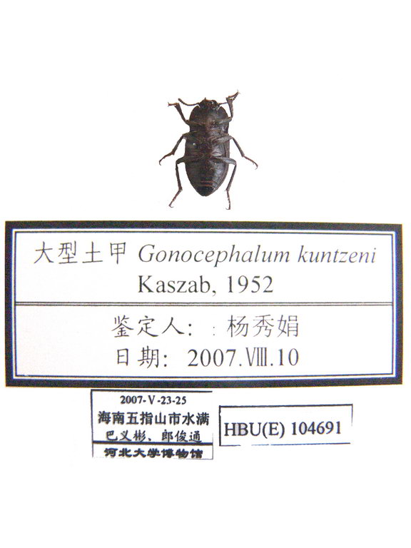 体长11.7-13.2mm;宽6.0-7.0mm。体粗壮,扁而平行,口须、触角和附节棕色。头宽扁,颊明显宽于复眼,颊角圆盾角形,与复眼前缘在一条直线上,侧缘向前显直地变窄;前胸背板扁平,宽几乎是长的2倍,中后部最宽,侧缘向前轻微地圆形变窄,向后近于平行,后角几乎无可见的尾;足细长,腿节下侧具锐棱边,上侧具弱脊,下侧扁平;前胸腹板宽,腹板突几乎无沟,向后下弯。腹部有规则的细颗粒,底部平坦有光泽,肛节不圆。