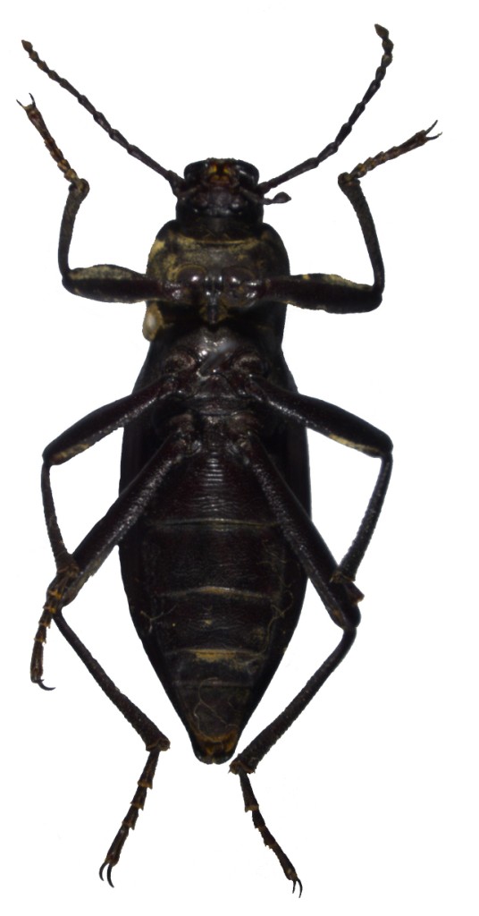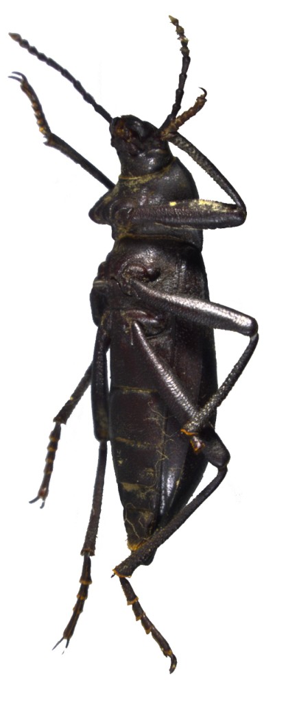 体中略大型,瘦长卵形,亮黑色。 ♂:上唇前缘深凹,具毛列;唇基前缘弧凹,基间膜外露明显,与额脊连接处缺刻较深;头顶隆起,细刻点略密。触角长过前胸背板基部;第2节很短,第3-7节圆柱形,第3节是第4节的2.1倍,第4-7节近于等长,第8-10节椭球形,长大于宽约的2倍,末节尖卵形;第2-11节长(宽)比为:3.5(4.0), 19.0(4.0), 7.0(4.0), 9.0(3.5), 8.5(3.5), 9.0(4.0), 6.0(4.0), 6.0(4.0), 6.0(4.0), 8(4.5)。颏小,椭圆形,粗糙。 前胸背板近方形,宽大于长1.1倍,前缘、最宽处、基部的较宽度比为:7.6, 11.0, 9.0;前缘略凹,无饰边;侧缘圆,饰边完整;基部饰边粗,中间隆起,两侧弯曲;基部略宽于端部;前角圆钝,后角直略锐角形;盘区及基部隆起,具细刻点。前胸侧板具杂乱皱纹和不明显的粒点;前胸腹突中沟较深,向后斜伸。 鞘翅长卵形,由背面可见侧缘饰边全长,中后半部最宽,端部明显变细,很扁地落下,但末端决不延伸成尖锐突;盘区具粗糙刻点和明显的刻点行;翅尾屋脊形,较为特别,外端角尖,并向下钩状弯曲;假缘折窄,有细刻纹和刻点。第1-3腹部可见腹板有较明显的横纹,端部2节有刻点;第1、2可见腹板间无毛刷。 足细长,前足腿节端部略收缩,胫节下侧有瘤突,端部向内弯曲;中、后足腿节有刺状毛;后足胫节中部弯曲,第1跗节对称,短于第2+3节,第1-4节长(宽)比为:24.0(8.0), 13.0(8.0), 13.0(7.0), 29.0(7.5)。 阳茎细长,基板为阳基侧突的2.1倍,阳基侧突长大于宽1.8倍,端部略向内弯曲。 ♀:翅尾短;端生殖刺突靴形;余特征同♂。 体长:♂ 19.0-20.0 mm,♀ 24.0-25.0 mm;宽:♂ 6.5-7.0 mm,♀ 8.5-9.0 mm。