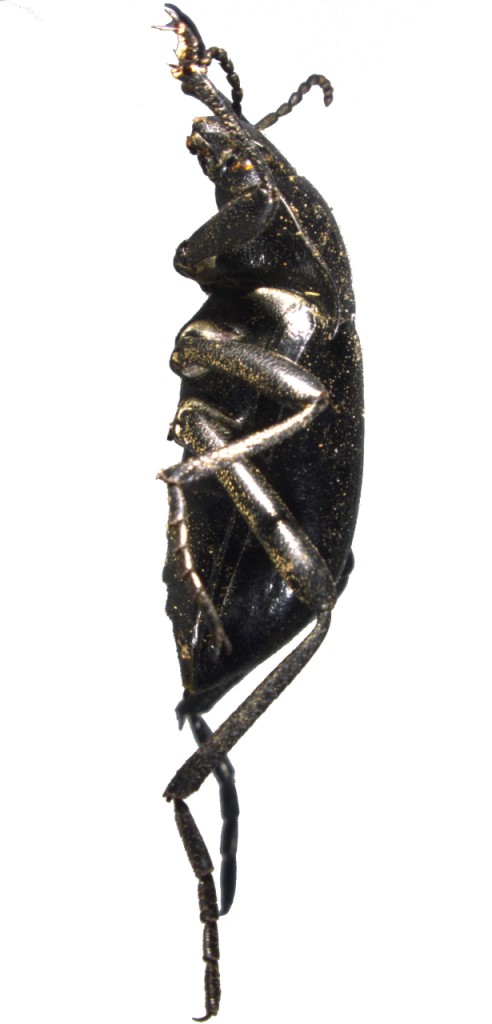 描述体狭长,尖卵形,亮漆黑色,仅跗爪和胫节端距棕色。