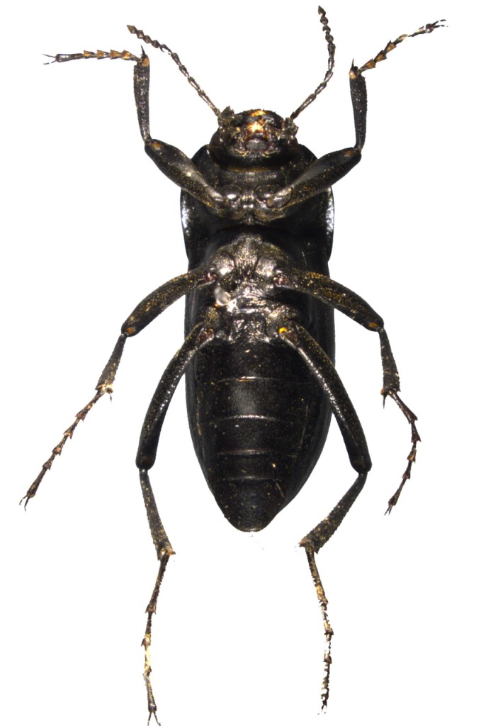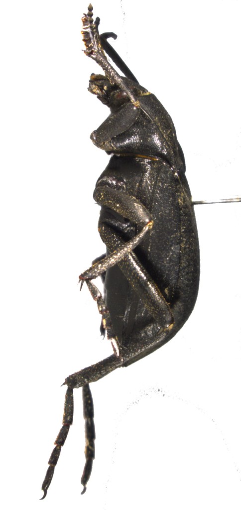 描述体黑色,狭长,背面无光泽,体下有弱光泽;触角栗褐色,口须、胫节端距和腹部中间发红。