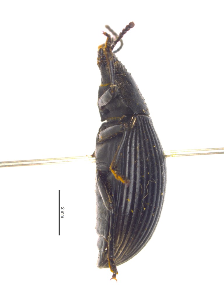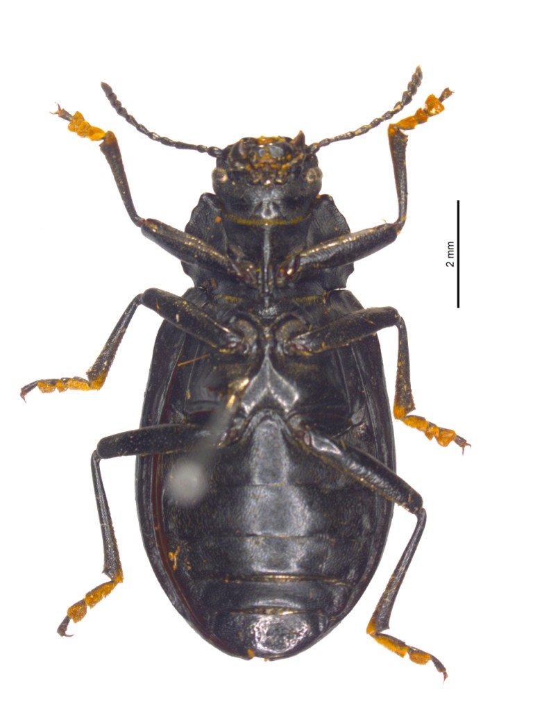 鞘翅行间明显隆起,纵条很窄且明显eingeachinitten,刻点行的刻点很细以至于几乎消失或行上没有蔓延,底暗淡。前胸背板圆盘形,相当扁平,暗淡,中部有稀疏的、向两侧皱纹状逐渐消失的刻点。前缘近于直,几乎不弯曲,有光泽的饰边围绕,侧缘弯曲,波浪状,后角略突出,直角形,前角微圆,近直角形。前胸腹板几乎直,基节突后部长直角形突出。中胸深V字形凹。 体长:13.5-15 mm。