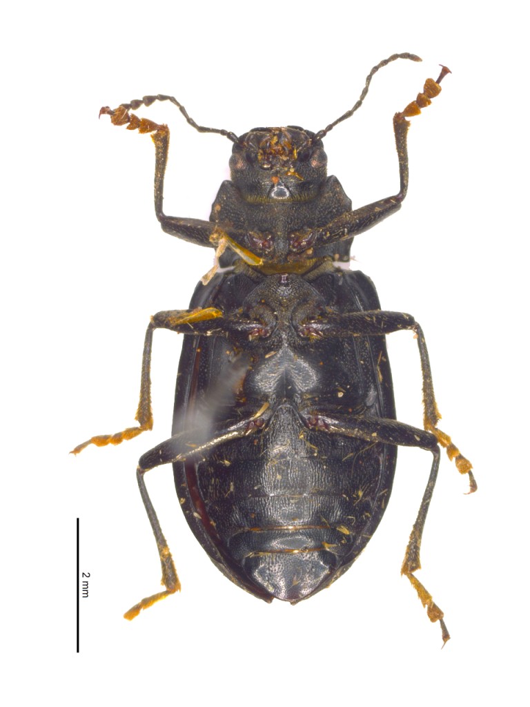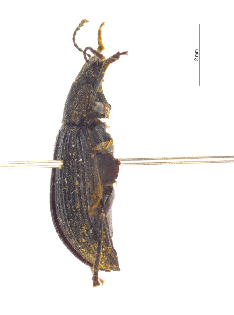 头和前胸背板很粗的皱纹状刻点,前胸背板宽,后角直角形,前角几乎不突出,短的略圆形的直角形,前缘几乎直,侧缘从后到中央弧弯。鞘翅行间有细的、稀疏的黄色毛。第8行间在末端简单的龙骨状,行间的突起有光泽,小,大多数圆形,在第3、5和7行间通常有短的龙骨突。 体长:10.2 mm。