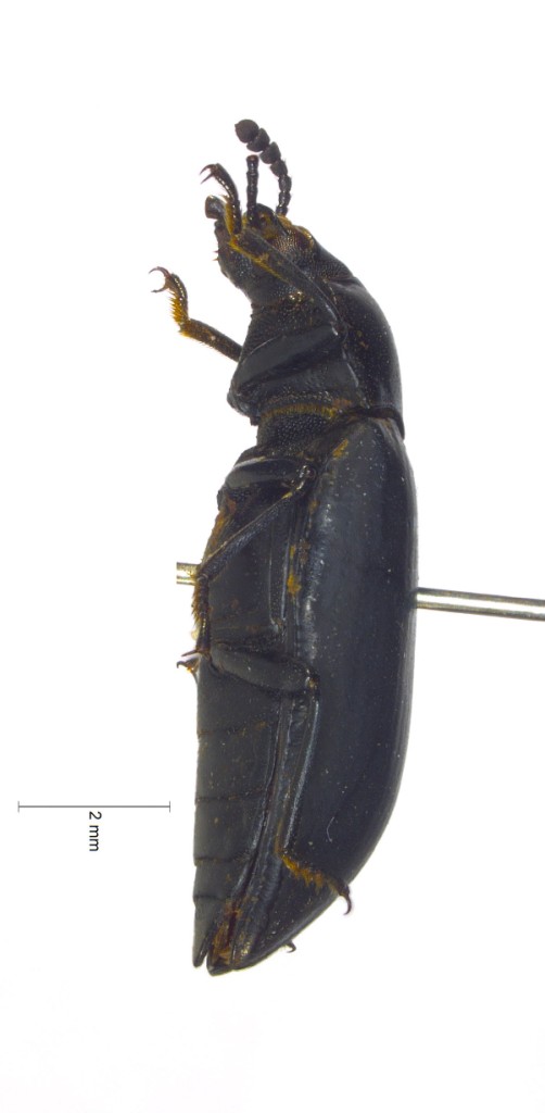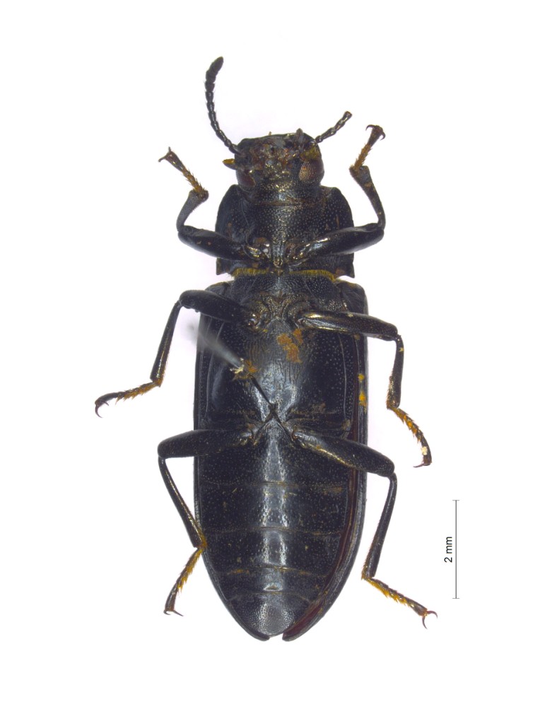 描述雄:黑色,触角、下颚须、跗节棕黑色到棕色,纵向平行。头和唇基中部相连,唇基中部的角长,末端扩展且分叉,向前弯曲倾斜;眼内缘角平行,狭长的,弯曲的,端1/2前面具黄色长毛,角间颅面半圆的弓形凹,角的大小稍有变化。头部具细小稀疏的刻点;触角可达前胸背板中部,端部4节扁棒状,末节半圆形,平坦,长宽约等,第3节长是宽的1.5倍。前胸背板近方形,两侧平行,前缘向前变窄,前角宽钝角形略向前倾斜;后角锐的,宽阔扁平,并形成轻微的尖角;前缘几直,后缘二曲的;盘区中部前面有点凹,后面扁平,具粗糙稠密大小不等的刻点;小盾片宽短,具细小刻点;鞘翅平行,中缝附近的刻点行细,向两侧逐渐变粗,刻点深,大,稀疏的排列;第7行排列着大约22个刻点,在第8行大约28个刻点。行间平,几乎无刻点;基部弱鲨皮状;前胸腹板和中胸具粗糙刻点,后胸更稀疏,并且腹部第1节刻点粗糙,第2节和第3节细小稀疏,肛节非常稠密细小的刻点。阳茎简单,端部尖锐的,侧面观末端是拱形的。