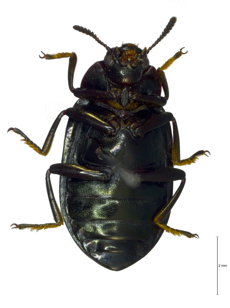 鞘翅椭圆形,隆起,长大于宽约 1.40 倍;端部弱变宽;点条线深,第 1 和第 2 点条线在基部连接,第 1 和第 9 点条线在端部连接,第 7 和第 8 点条线不达肩胛基部;点条线的刻点稀疏,规则排列,较行间刻点大,侧缘和端部的渐小;行间有小刻点,稀疏。肩胛不膨大。