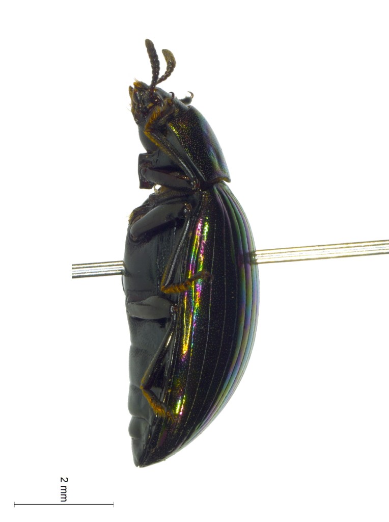 描述椭圆形,稍长,有光泽。体暗红棕色,头黑色,前胸背板紫色,基部角金属绿色,盘区有三个斑块,中间的较大,近方形,蓝黑色,占据盘区较大部分,外层绿色,内层金属蓝色;其他两个斑块小而圆,金属绿色,靠近前缘和侧缘。鞘翅紫色光泽,每个鞘翅的肩部和端部各有 1 横带和 4 个斑块,横带和斑块间铜绿色,翅缝靠近基部铜绿色靠近端部铜紫色;横带具彩色的饰边,外缘成齿