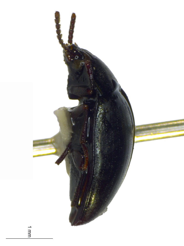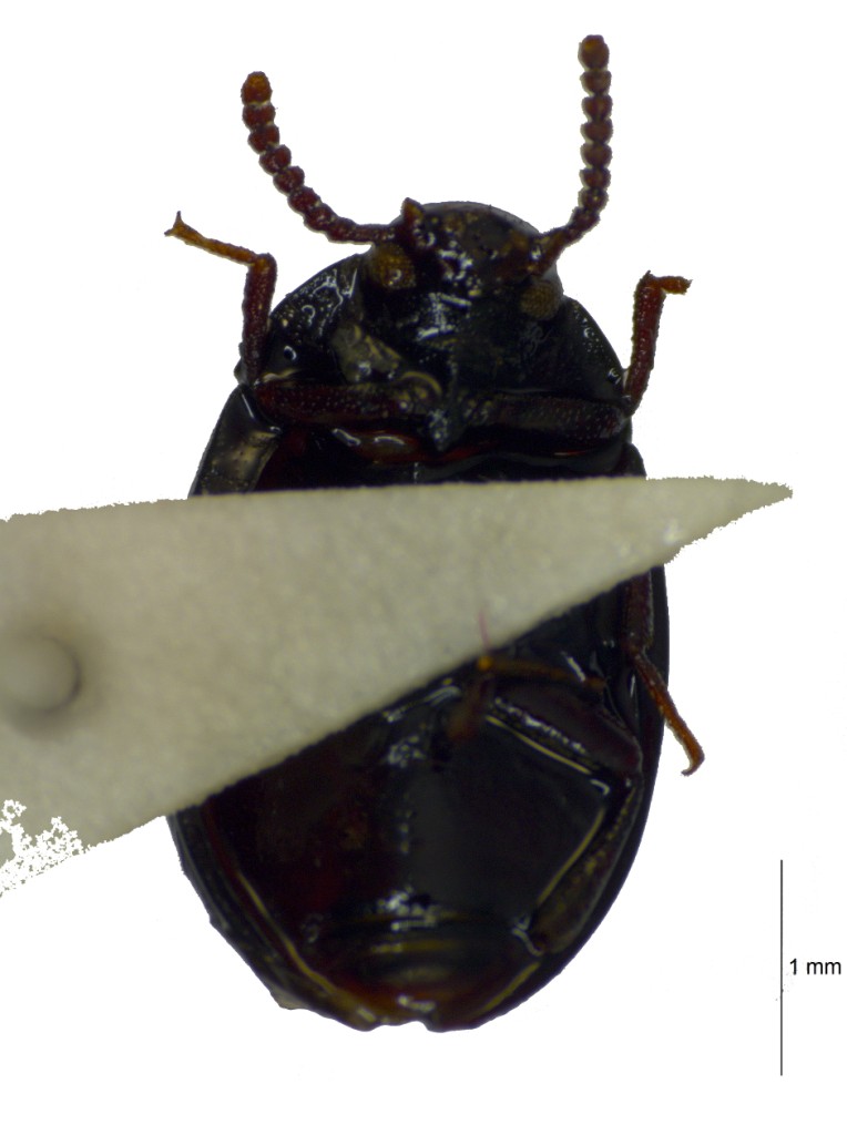 描述体卵形,强烈隆起。除复眼,触角,下颚须,足为褐色外,背面观为单一黑色,具强烈金属光泽;腹面单一黑色。头上无角,额下陷,向前倾斜与唇基相接。唇基缝明显,唇基前缘弱弧形,颊与复眼相接处凹陷,深切入复眼。复眼间距为眼宽的0.64倍,为头宽的0.24倍。触角8节膨大,近念珠状。头上密布粗刻点。下颚须末节斧状。前胸背板宽大于长,宽为长的2.41倍;基部最宽,为端部的1.56倍,表面平坦,盘曲扁拱,基部无凹;后缘叶状突不明显。前角钝圆,微前伸;除后缘外均具明显饰边。前胸背板上密布刻点,直径小于头上刻点。小盾片三角形,边缘深红褐色,表面近光裸。鞘翅长为宽1.31倍,基部与前胸背板基部近等宽;盘区强烈隆起,肩部不隆起。具刻点行,无刻点沟,行上刻点较浅小盾片线模糊,约有5个刻点;行间宽阔平坦,有刻点均匀分布,直径与前胸背板上刻点相近。鞘翅饰边窄而完全就,达鞘翅末端。前胸腹突成菱形,前窄后宽。第1-3腹板密布粗刻点,中线部分具短刚毛,3-5腹板间节间膜较窄。肛节短小。