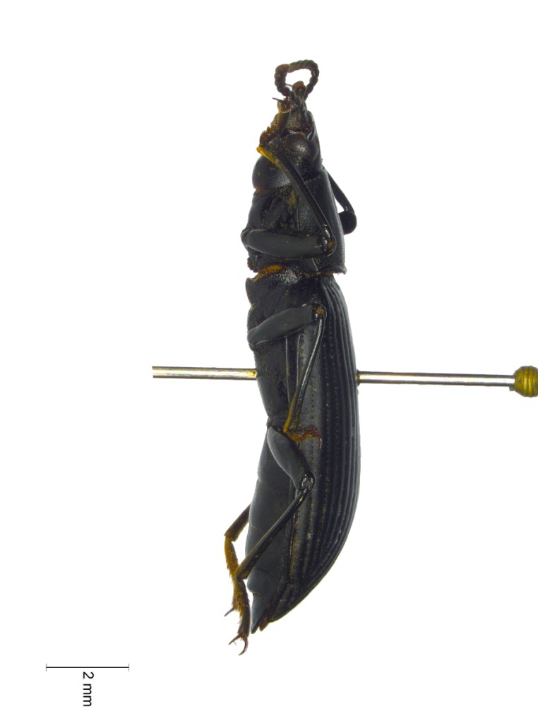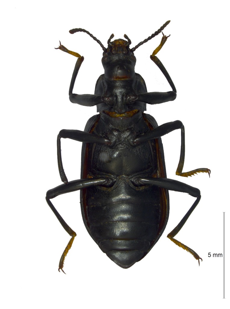雄性:体细长,较隆起;黑色略有光泽,复眼、触角和下颚须棕色。上唇半圆形;唇基端部有粗而长的黄毛,中部横隆,小刻点密,前缘直、微凹;唇基沟不明显;前颊弧形弯曲,微拱起,窄于眼,后颊收缩。眼内侧有两条纵褶,额区较平,疏布具微毛的硬刻点。触角粗壮,长达前胸背板中部,第3~6节棒状,第7节开始渐变宽,第7~9节长宽几乎相等,端节长约是宽的1.3倍;第2~11节相对长(宽)度之比为:5.0(6.0), 13.0(6.0), 6 分类记述- 67 - 10.0(6.5), 9.0(7.0), 10.0(8.0), 9.0(8.0), 9.0(8.5), 8.5(8.5), 8.0(8.0), 13.0(8.0)。颏舌状,长刚毛呈“U”形密布。前胸背板隆起,近方形,长是宽的1.17倍,中部最宽;前缘近于直,仅两侧有饰边;侧缘中部呈钝角,向前后收缩,饰边完全;后缘二弯状,饰边完整;前角钝直角形,后角尖直角形。盘区中央浅凹,浅刻点稀疏。小盾片发达,尖角形。鞘翅基部比前胸背板宽,长为宽的1.2倍;翅面刻点行粗,行间隆起,有稀疏的微小刻点;基部无肩;侧缘饰边在背面完全可见,假缘折从肩部向后逐渐变细,宽不短缩。前胸腹板有皱纹;腹突端部膨大,并有1横凹。中胸腹板中线为1光滑纵中脊,两侧密布小颗粒。后胸腹板中央凹陷有皱纹,并着生毛。腹部几节布满皱纹和刻点。各足腿节下侧平,光裸;跗节腹面密被刷状金黄色毛。前足胫节基3/4直,端1/4处具宽圆的凹陷,并向内强烈弯曲;后足胫节向端部轻微变粗,从基部到基7/12处内侧具钝角,端1/3处密被柔毛。前、中、后足各跗节(由基部向端部)相对长度之比为:8.0, 4.0, 3.5, 4.5, 25.0;9.0, 3.5, 5.0, 5.0, 26.0;18.0, 6.0, 8.0, 29。阳茎弧形弯曲,基侧突向顶端收缩,顶钝;基板为基侧突长的1.74倍,两侧平行。 ♀颏强烈隆起,被细而稀疏柔毛。前胸背板强烈横宽(6.5:9.0)。前足胫节向端部逐渐加宽,基3/5几乎直,端2/5微向内下方圆弯;中足胫节微扁平,端3/5非常微弱的向内上方弯;后足胫节基部1/2几乎直,端部1/2轻微内弯,跗节腹面被细的稀疏毛。 体长:17.4~23.8 mm;宽6.3~8.8 mm。