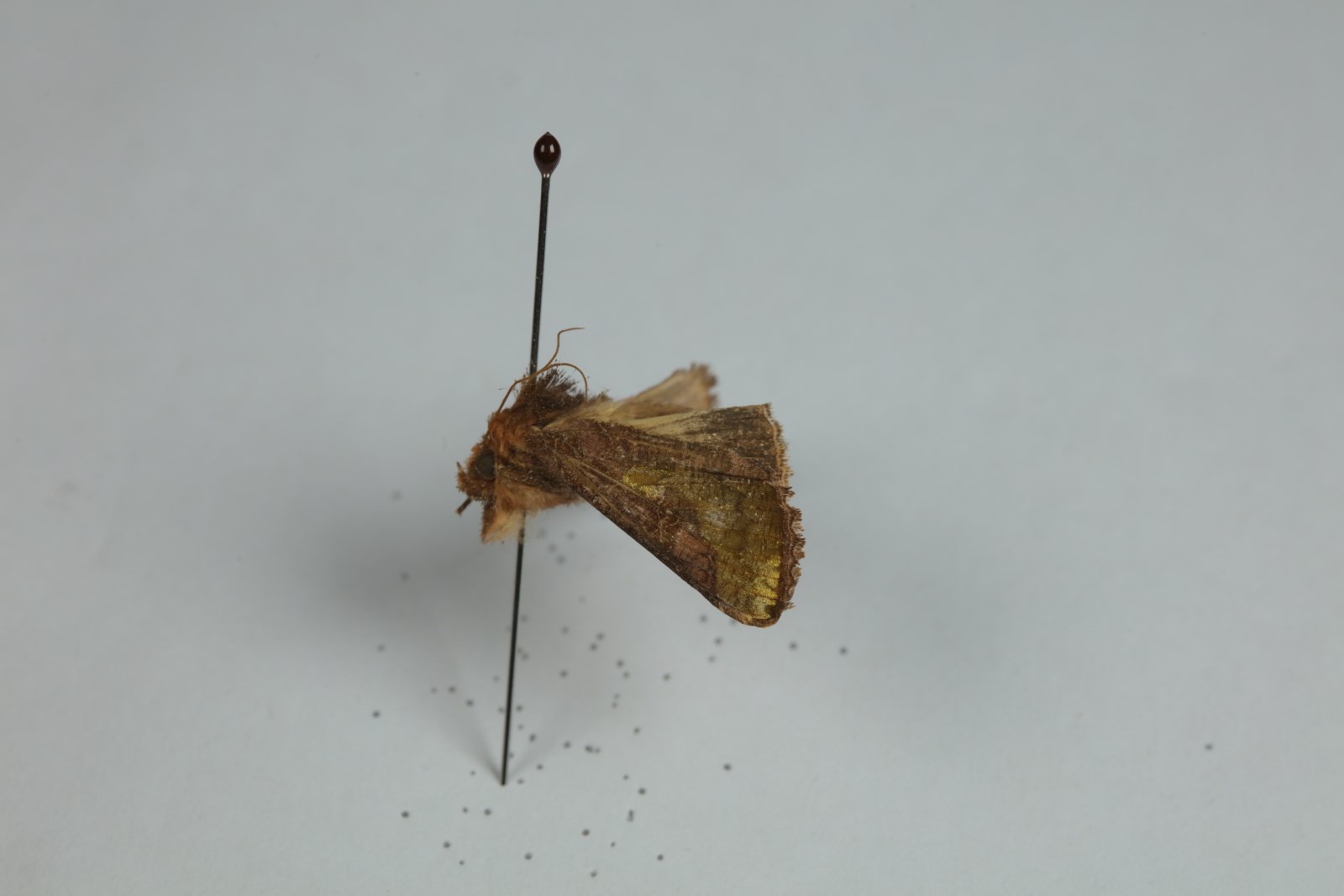 前翅长18 mm。头部与胸部为红褐色,触角背面有白褐相间的鳞片;翅基片及胸部后部褐色;足褐色;腹面黄白色,基节毛簇褐色,腹部侧面及末端带红褐色。前翅深褐色;亚基线和内线灰色,细;环纹和肾纹为灰色细纹,均不明显;翅端半部由前缘外1/4处起至M1后向内伸,最后沿Cu2扩展至中室后缘的部分为大片金黄色;外线前半段褐色,明显,后半段不清晰;亚缘线、缘线和缘毛褐色。后翅黄白色,端半部浅褐色;中室端有褐色纹;缘毛黄褐色。前翅反面黄褐色,前缘部分带红褐色,R脉后和亚缘线内侧暗褐色。