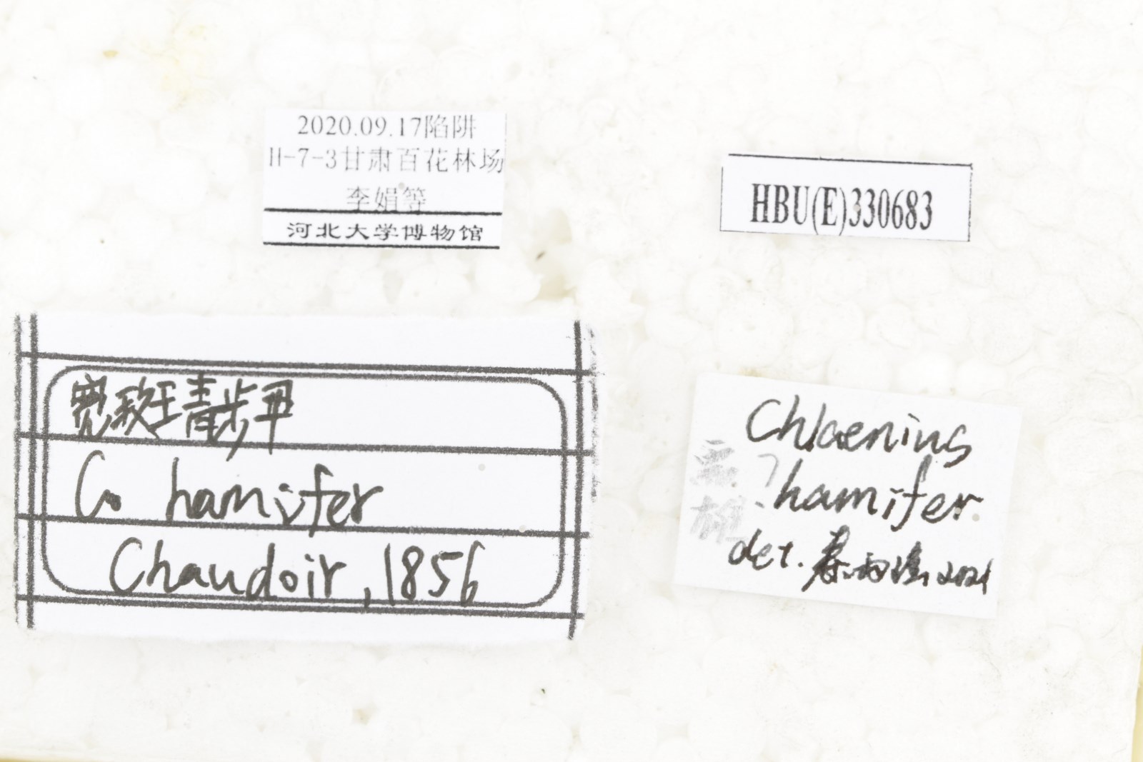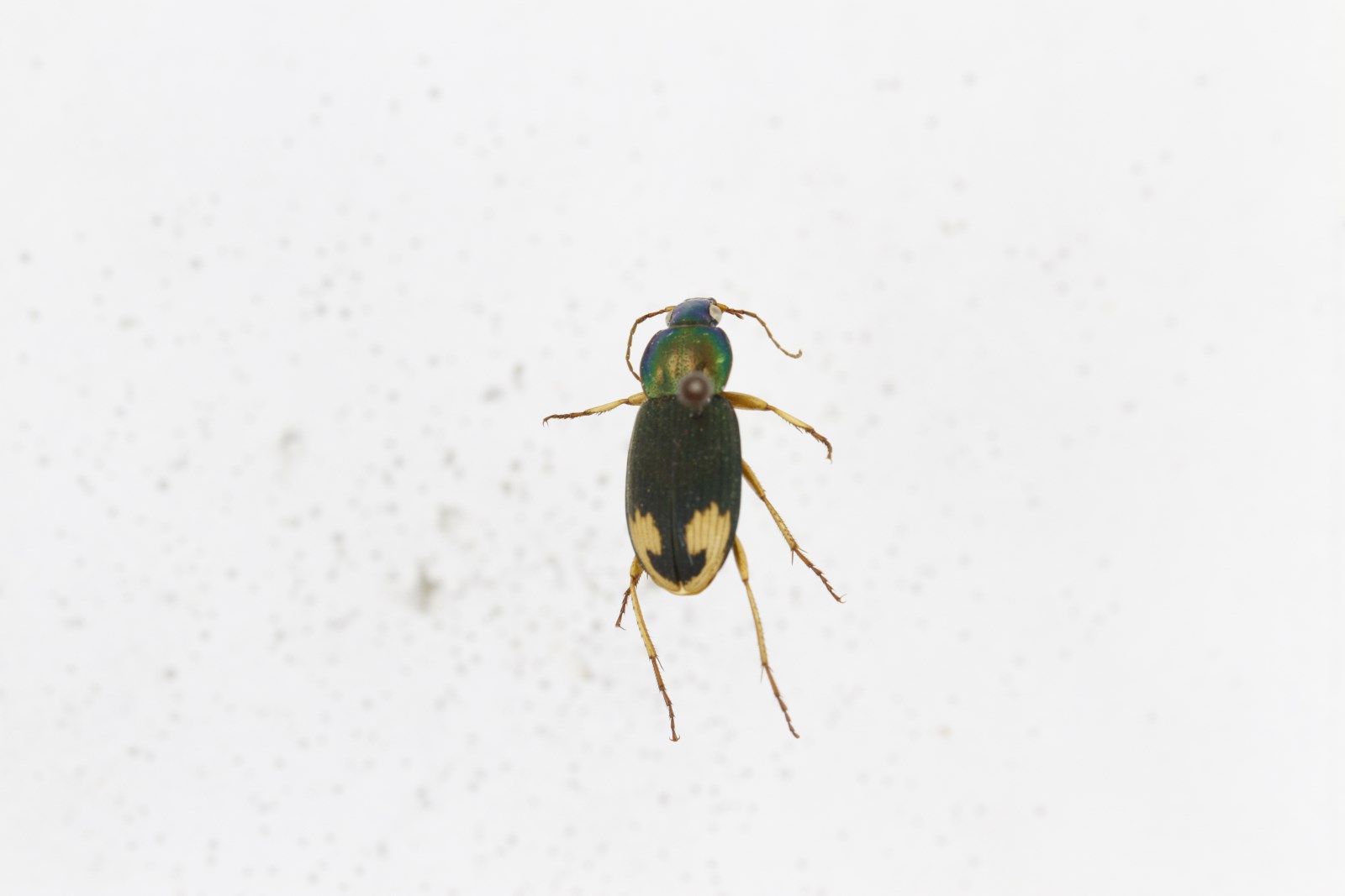 描述属征:中型到大型,体长10~25 mm。虫体常具绿色或蓝色金属光泽,至少头部如此,许多种类鞘翅有黄色圆斑点或侧边有黄色条带。眼内侧具眉毛1根;上颚外沟无刚毛;颈区不明显缢缩;口须端节平截,不细尖,唇须亚端节一般光洁,无刚毛;触角自第4节密被绒毛(有些种类第3节具稀疏绒毛,明显比第4节少)。前胸背板多样,一~般横方,少数心形;后角毛在后角之上或后角之前;表面大部分有刻点和毛,少部分盘区光洁。鞘翅最宽处在中部略后,侧边向后不明显加宽,条沟深。足细长,爪一般简单(少数种类具梳齿);雄虫前足1?~3节跗节膨宽,呈方形。