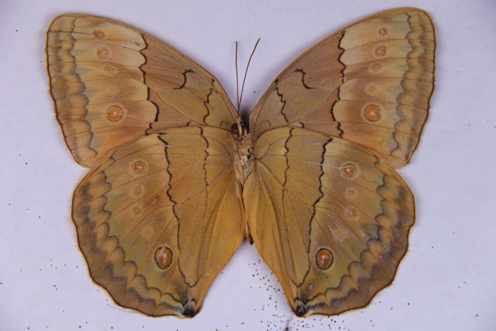 大型环蝶。雄蝶背面为同一均匀的橙黄色,前翅翅顶有黑色纹,前后翅外缘排列着清晰的黑色箭形纹,腹面有2道黑褐色线纹,前翅中室端两线纹间有短小的反S形短纹,前后翅排列着1串橙色圆斑。雌蝶斑纹与雄蝶相似,腹面底色更偏青黄,前后翅的外横线外伴有白斑。