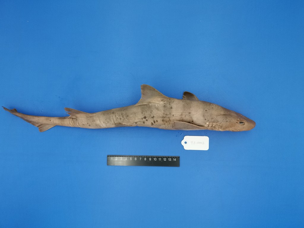 体延长,前部粗大,尾部细长。吻中长,具瞬褶。喷水孔小,位于眼后。背鳍2个,形状相同,第二背鳍较小,第一背鳍起点在胸鳍内角之上方或稍后,第二背鳍起点在臀鳍之前。体灰褐色,腹面浅灰白色,沿体侧暗色横纹13条和许多大小不一的黑色斑点。