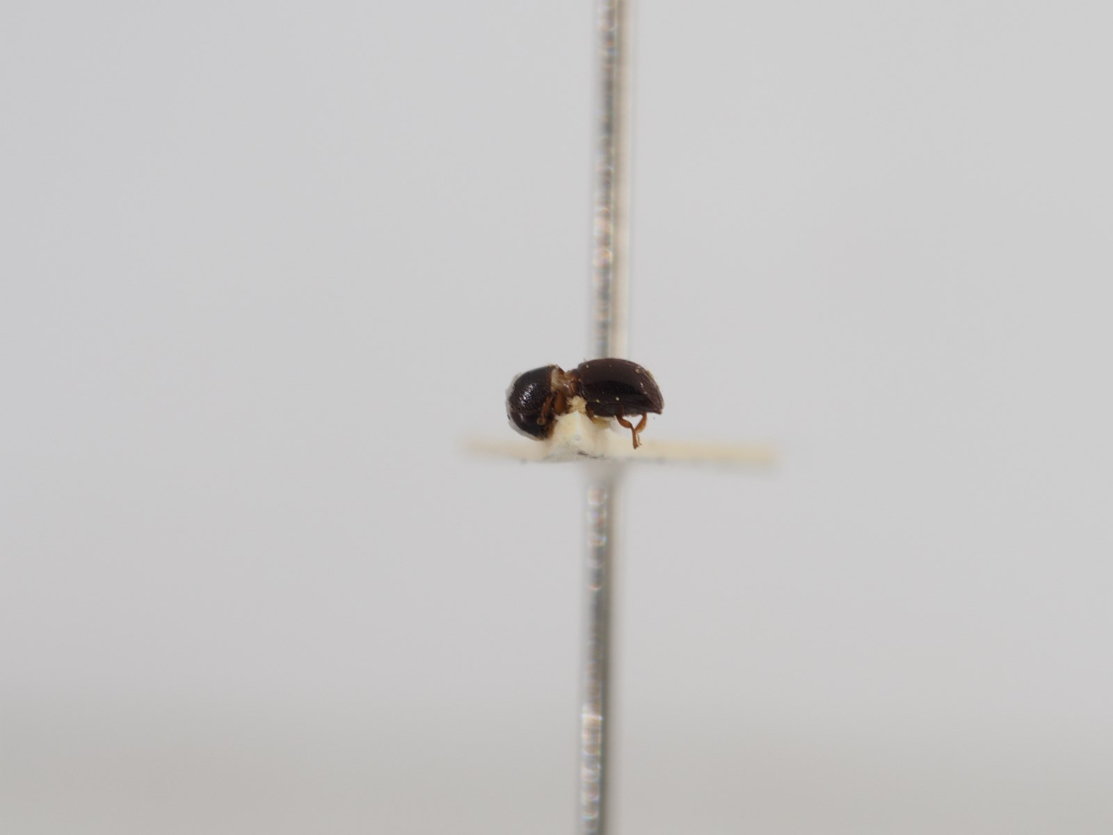 雌虫体长2.3亳米。体褐至黑祸色,体表光亮,翅后半部有细弱毛列。额面平,刻点下密上疏,均为纸小颗粒,因而整个额面比较粗糙,但仍旧光亮,额底面细网状,中龙骨位于额下部,根短,窄而低平,额毛较少。 前胸背板长略小于宽, 长宽比接近于L, 背面观前缘和前侧连合弓曲呈圆弧形,后偲平行;整个背板导方盾形,背中部最高,背板表面的瞵状瘤粗糙而稠密,前缘一排比较明晁, 刻点区表面有时略有谮皱,但底面光亮,不显细网状,没有背中线,背顶部前面的小瘤和后面的刻点常红成同心圆,环绕在顶部上,整个背葺毛疏短, 荫密后疏,分布正常。小盾片较大,呈圆三角形,平坦而光亮。 鞘翅长为前胸背板长的1.7倍,鞘翅表面平滑光亮; 刻点沟稍微凹陷,沟中刻点稍大于沟间部刻点,排列规则; 沟问部较宽阔,略降起,当中有一列细小稀疏的刻点; 鞘翅斜面正常,没有特殊构造,翅后部沟问部的刻点中心各生1根茸毛,排成毛列,翅后半部刻点沟中刻点不生茸毛。