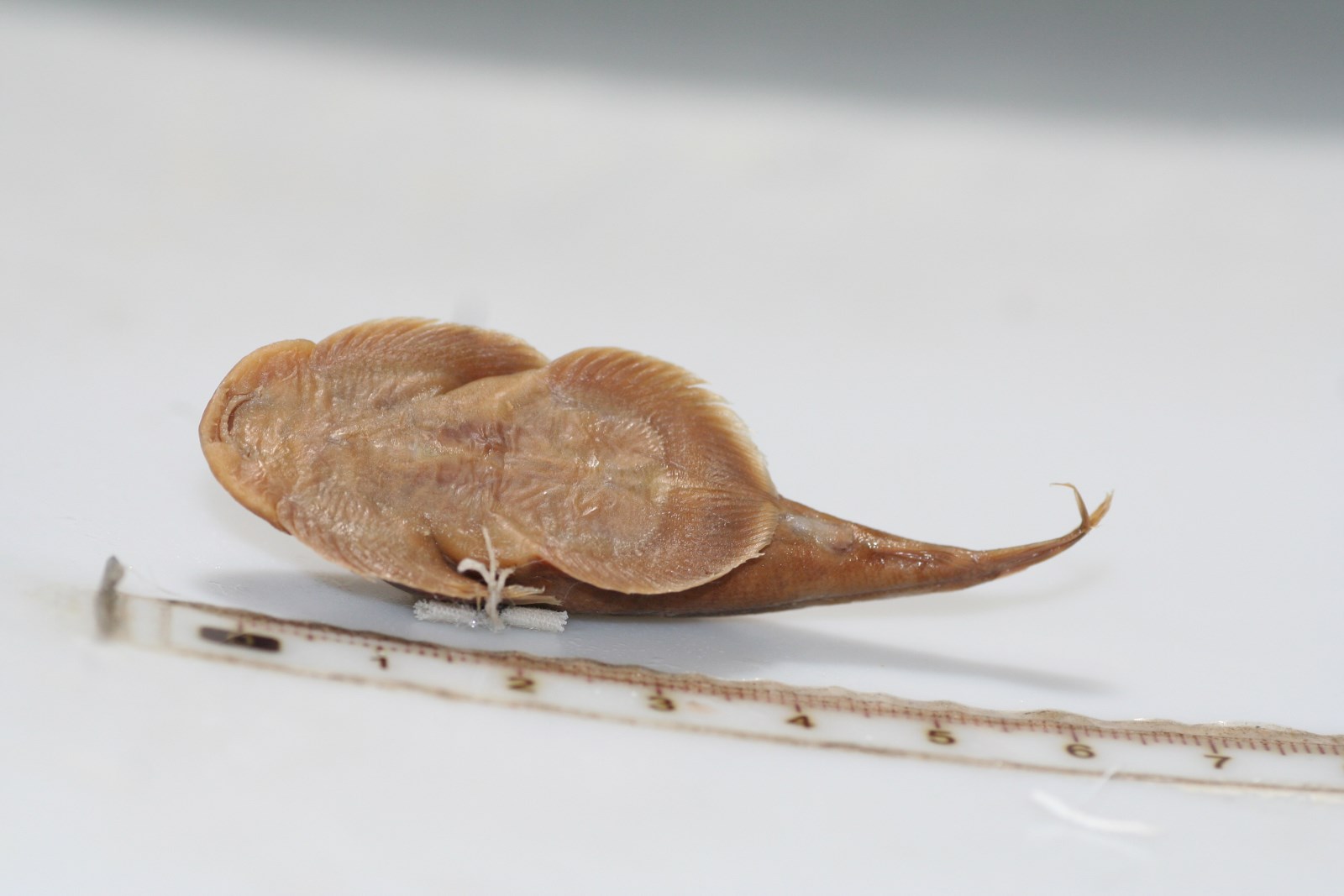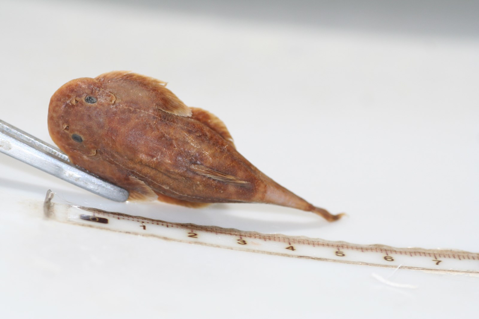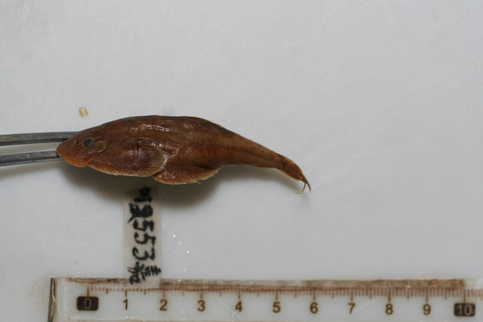 体褐色,腹部白色;头背和腹侧具不规则的黑褐色斑点,背中线有8-10个黑褐色斑块;背、尾鳍各具2行黑褐色短条状点列。